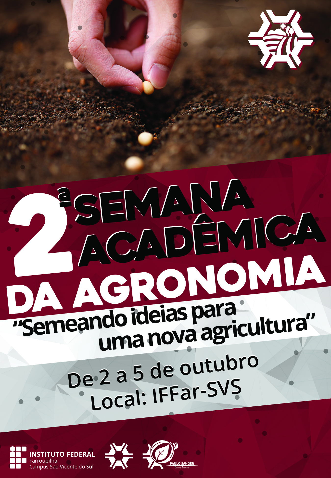 Acontecerá de 2 à 5 de outubro no Instituto Federal Farroupilha campus São Vicente do Sul, a 2º Semana Acadêmica da Agronomia, onde o tema proposto é "Semeando Ideias para uma nova Agricultura".