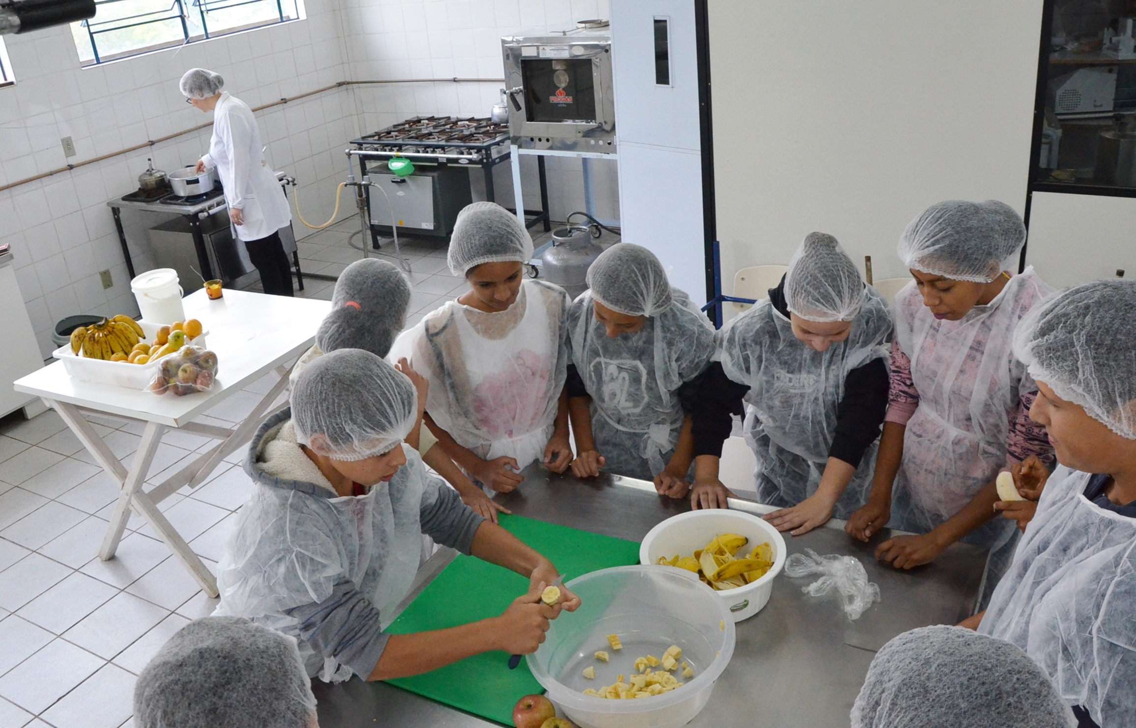 Estudantes ajudam no preparo da salada de frutas sem açúcar