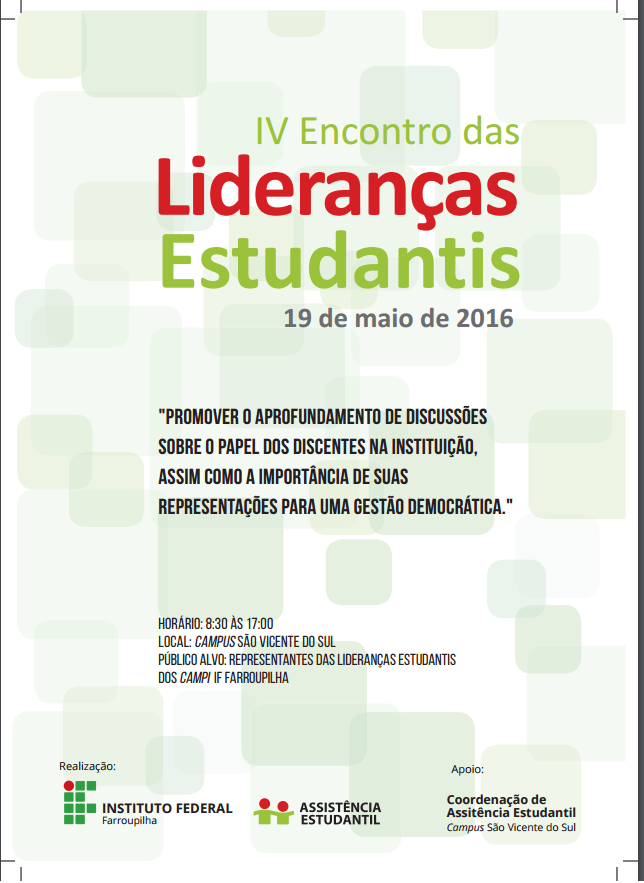 O Campus São Vicente do Sul sediará no próximo dia 19 de maio, quinta-feira o IV Encontro das Lideranças Estudantis do Instituto Federal Farroupilha, com o objetivo geral de "Promover o aprofundamento de discussões sobre o papel dos discentes na Instituição, assim como a importância de suas representações para uma gestão democrática."