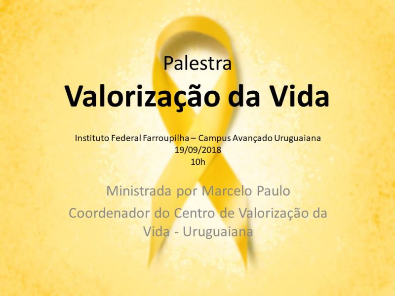 O dia 10 de setembro foi instituído como Dia Mundial da Prevenção ao Suicídio. Para trazer em pauta a preocupação do Instituto Federal Farroupilha com os altos índices de suicídio que assolam a nossa população, será realizada no Campus Avançado Uruguaiana uma Palestra voltada para a temática da valorização à vida, como uma ação inerente à campanha do Setembro Amarelo.