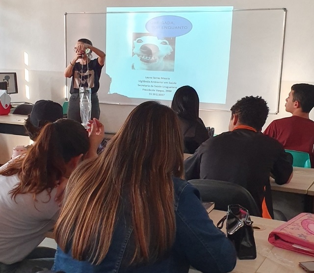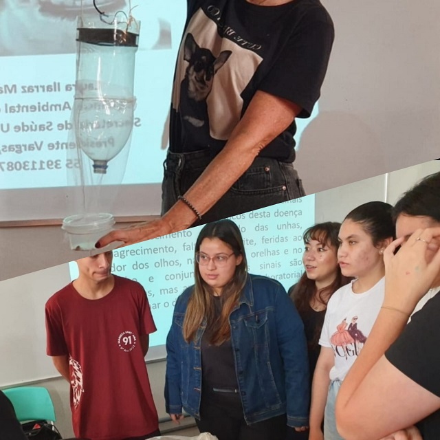 A convite da presidente do NUGEA, Diana Neves, veio ao Campus a coordenadora da vigilância ambiental do município, Laura Massia, a qual abordou o tema Leishmaniose, durante aulas de biologia da professora Anelise Cruz e entrevistas.