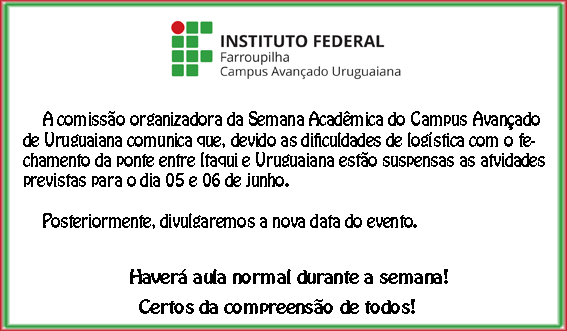 A comissão organizadora da Semana Acadêmica do Campus Avançado Uruguaiana comunica que, devido as dificuldades de logística com o fechamento da ponte entre Itaqui e Uruguaiana estão suspensas as atividadas previstas para o dia 05 e 06 de junho.
