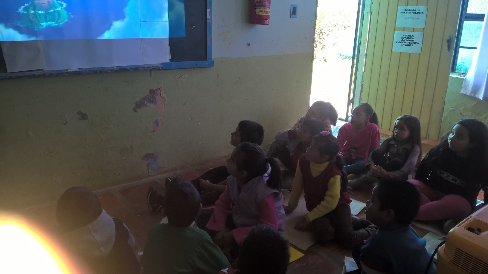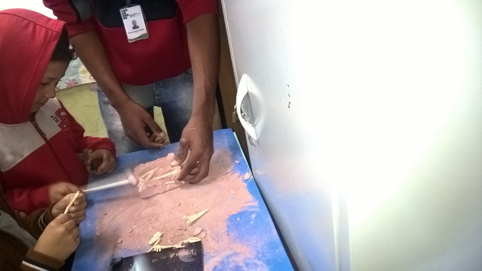 As crianças puderam associar tipos de pegadas a diferentes dinossauros, fazer uma escavação em um bloco de rocha e cada uma ganhou uma réplica de fóssil em gesso. A escola também ganhou uma coleção de rochas e minerais. Todos os envolvidos agradecem imensamente o carinho com que fomos recebidos pela escola.