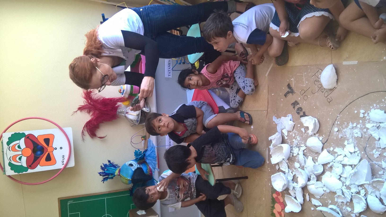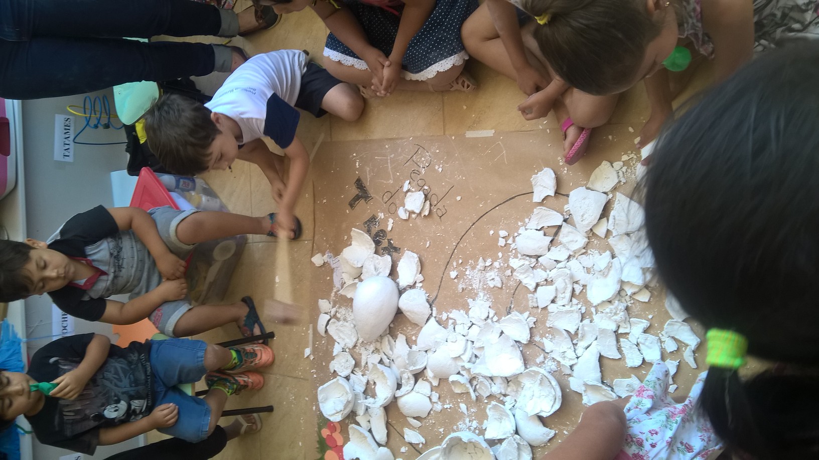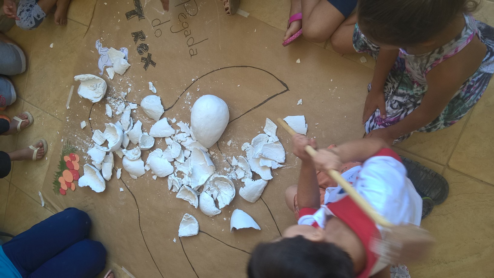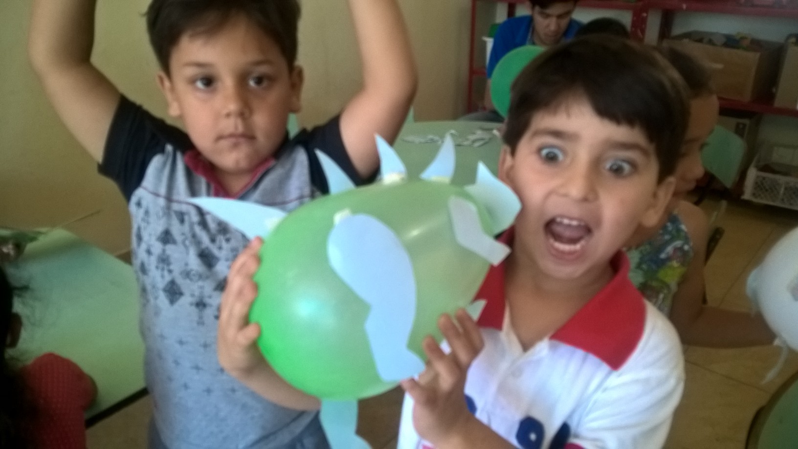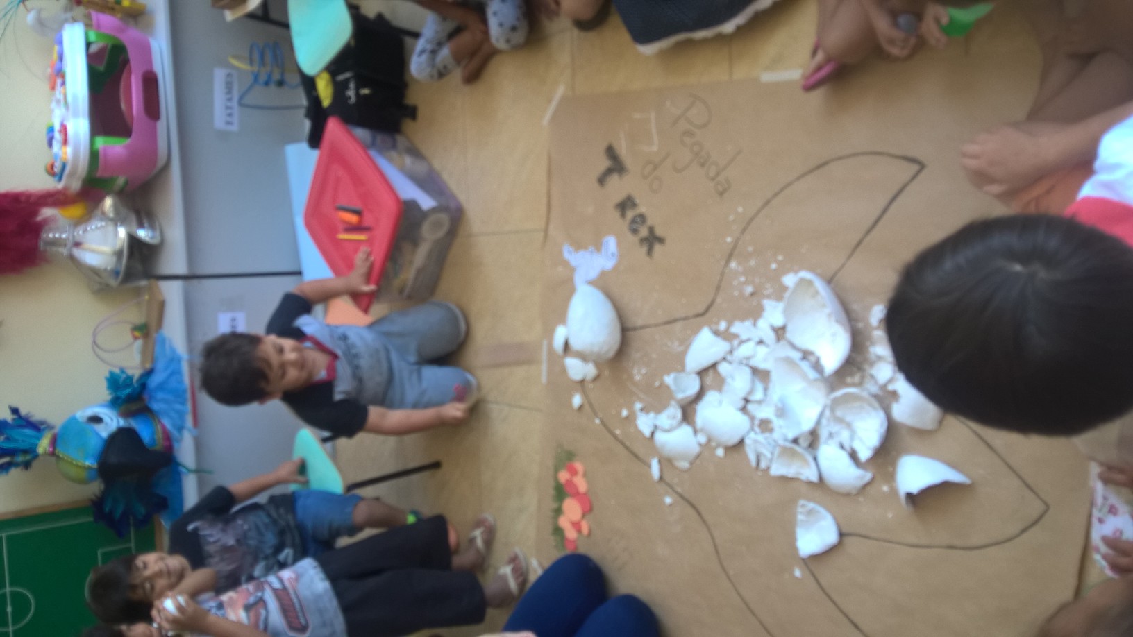 A professora da turma está trabalhando o conteúdo "ovos" e a atividade teve o propósito de aprofundar o conhecimento das crianças sobre dinossauros e ovos de dinossauros. Durante a atividade, as crianças conheceram ninhos de ovos de dinossauro, o Oviraptor (dinossauro ladrão de ovos), montaram dinossauros com balões de festa e quebraram ovos de dinossauro, todos com filhotinhos de dino dentro.
