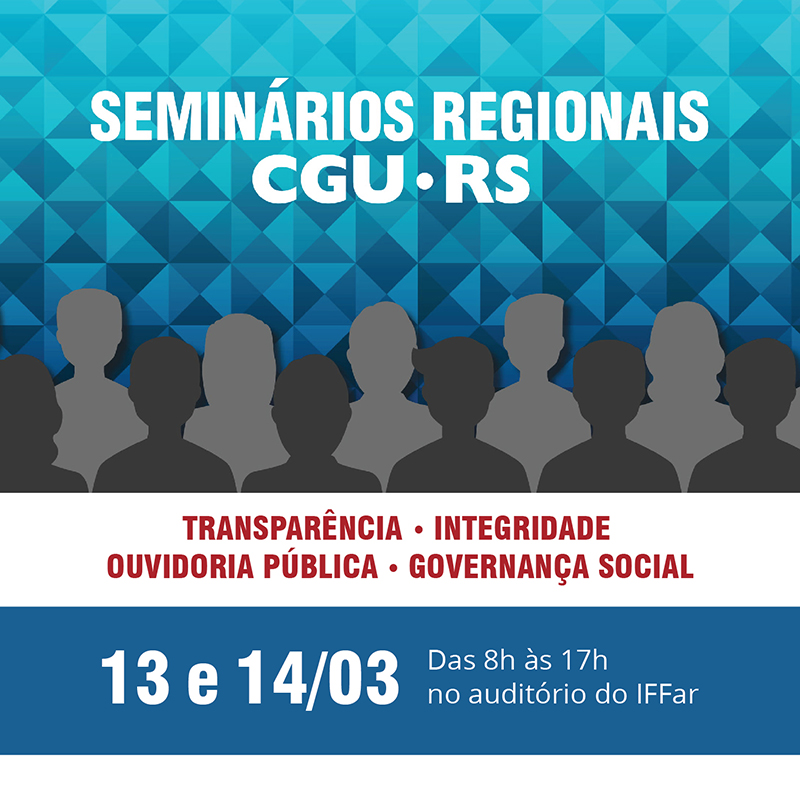 O IFFar vai sediar uma etapa do Ciclo de Seminários Regionais da Controladoria Geral da União (CGU-RS) nos dias 13 e 14 de março. O evento vai tratar sobre os temas transparência, ética e integridade, participação social e as novas funções da Ouvidoria Pública.