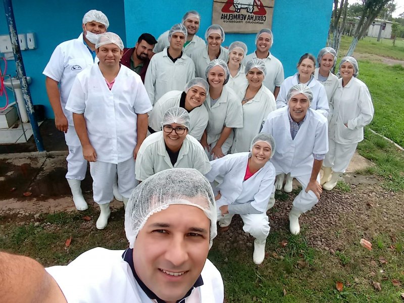 O grupo foi recepcionado inicialmente pela médica veterinária Claci Temp, responsável técnica do estabelecimento, e pelo médico veterinário Gabriel Nunes Charão, servidor do Serviço de Inspeção Municipal (S.I.M.) de Alegrete. Claci pontuou que a planta realiza o abate de aproximadamente 200 ovinos ao dia, necessitando de rigoroso controle e permanente sintonia com o mercado consumidor para atender as demandas por produtos cárneos. Gabriel complementou que o Coxilha Vermelha está ampliando sua planta fabril mediante a construção de uma seção para produtos cozidos, a partir da qual será possível a produção de salsichas, patês, mortadelas e demais derivados da carne ovina.
