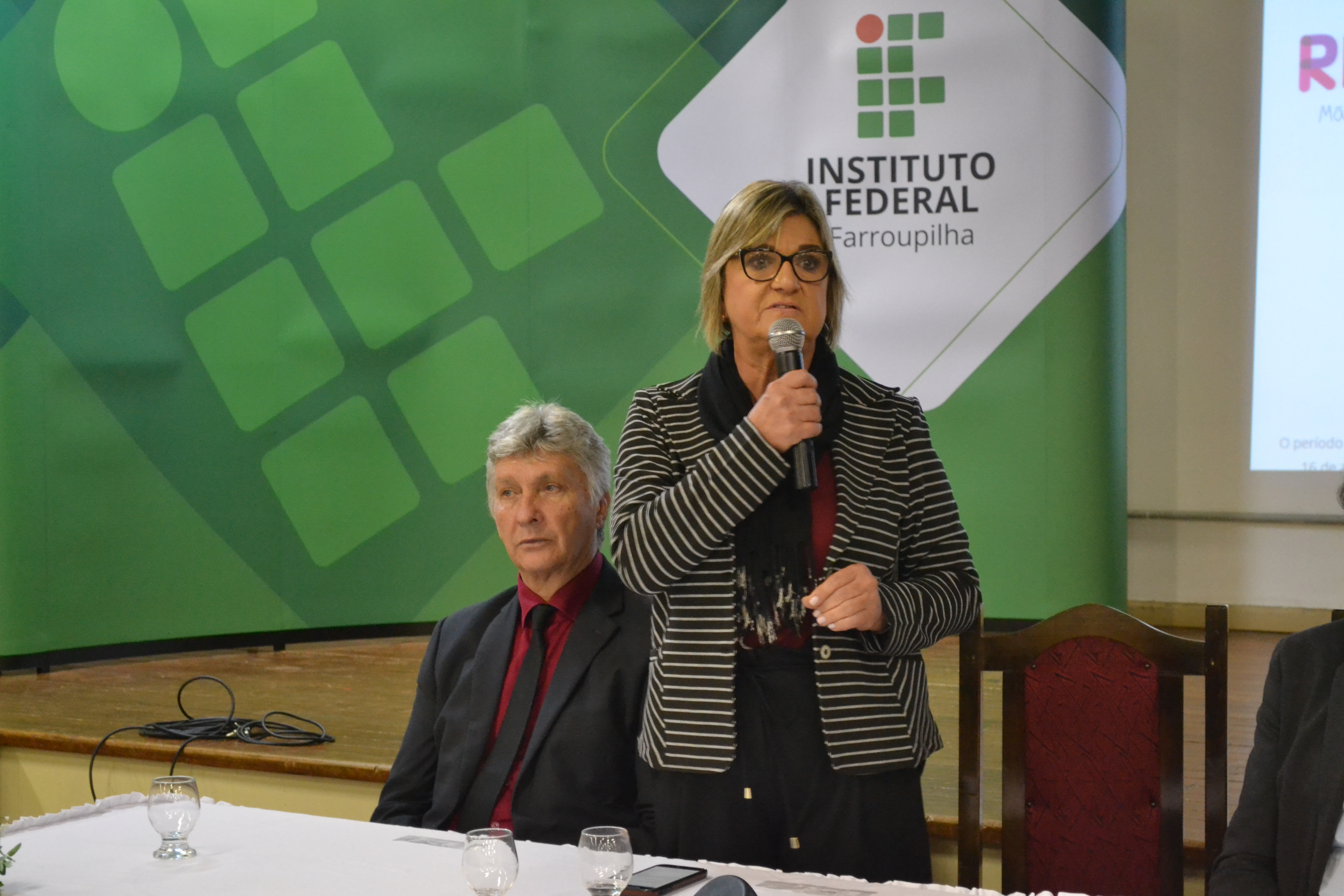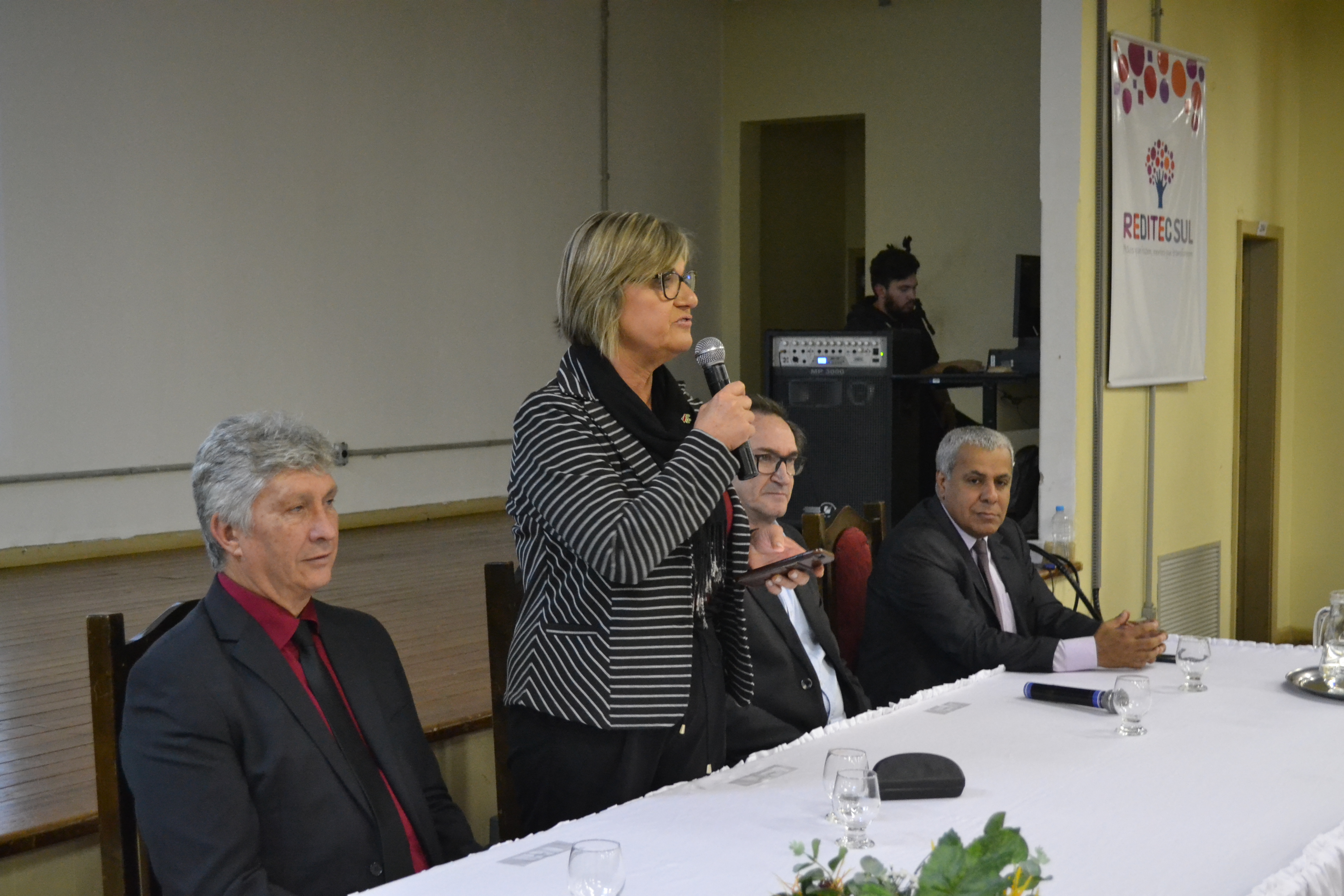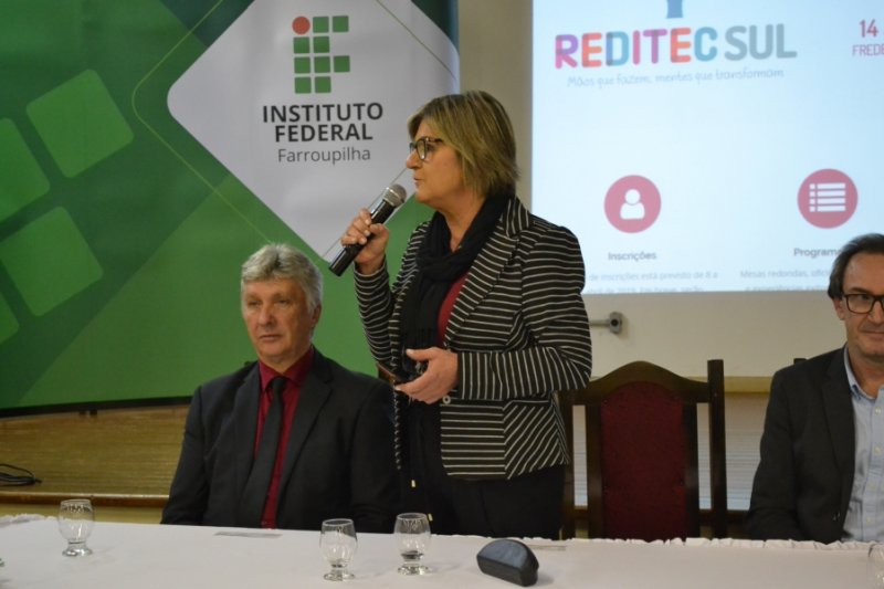 Foto: a reitora do IFFar, professora Carla Jardim, fala durante mesa de abertura da Reditec Sul 2019