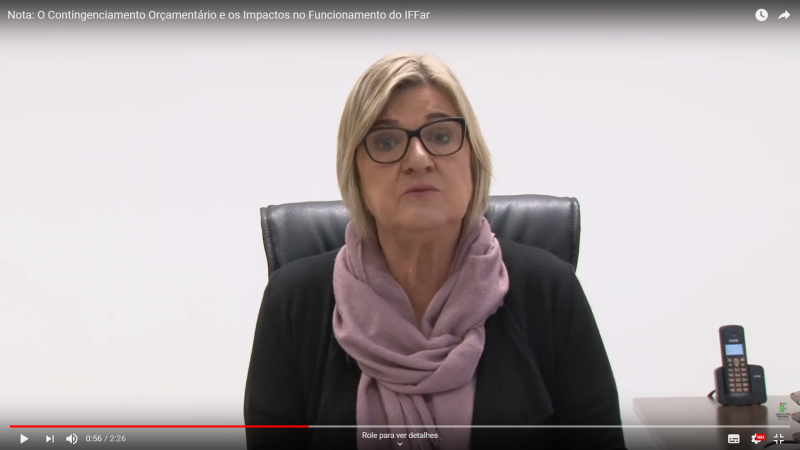 No vídeo, a Reitora explica as repercussões do bloqueio orçamentário de 30% no orçamento das instituições federais de ensino brasileiras. O bloqueio representa um corte de 40% nas despesas de custeio do Instituto Federal Farroupilha. Essas despesas estão relacionadas com o funcionamento da instituição, como contas de água, luz e internet e pagamento de funcionários terceirizados.