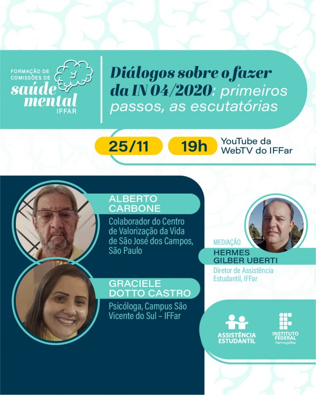 O evento será transmitido pela página da WebTV do IFFar no Youtube. Participam da conversa Alberto Carbone, colaborador do Centro de Valorização da Vida (CVV) de São José dos Campos, e Gracielle Dotto Castro, psicóloga do IFFar – Campus São Vicente do Sul. A mediação será feita pelo professor Hermes Uberti, diretor de Assistência Estudantil do IFFar.