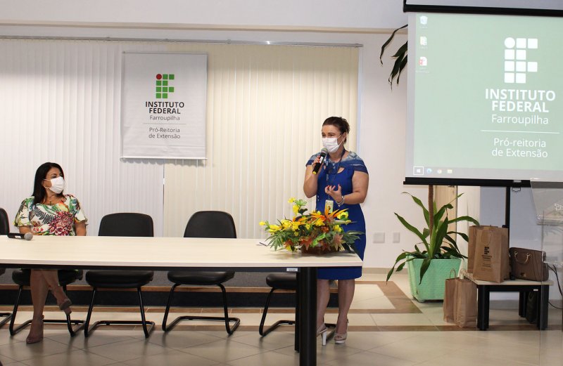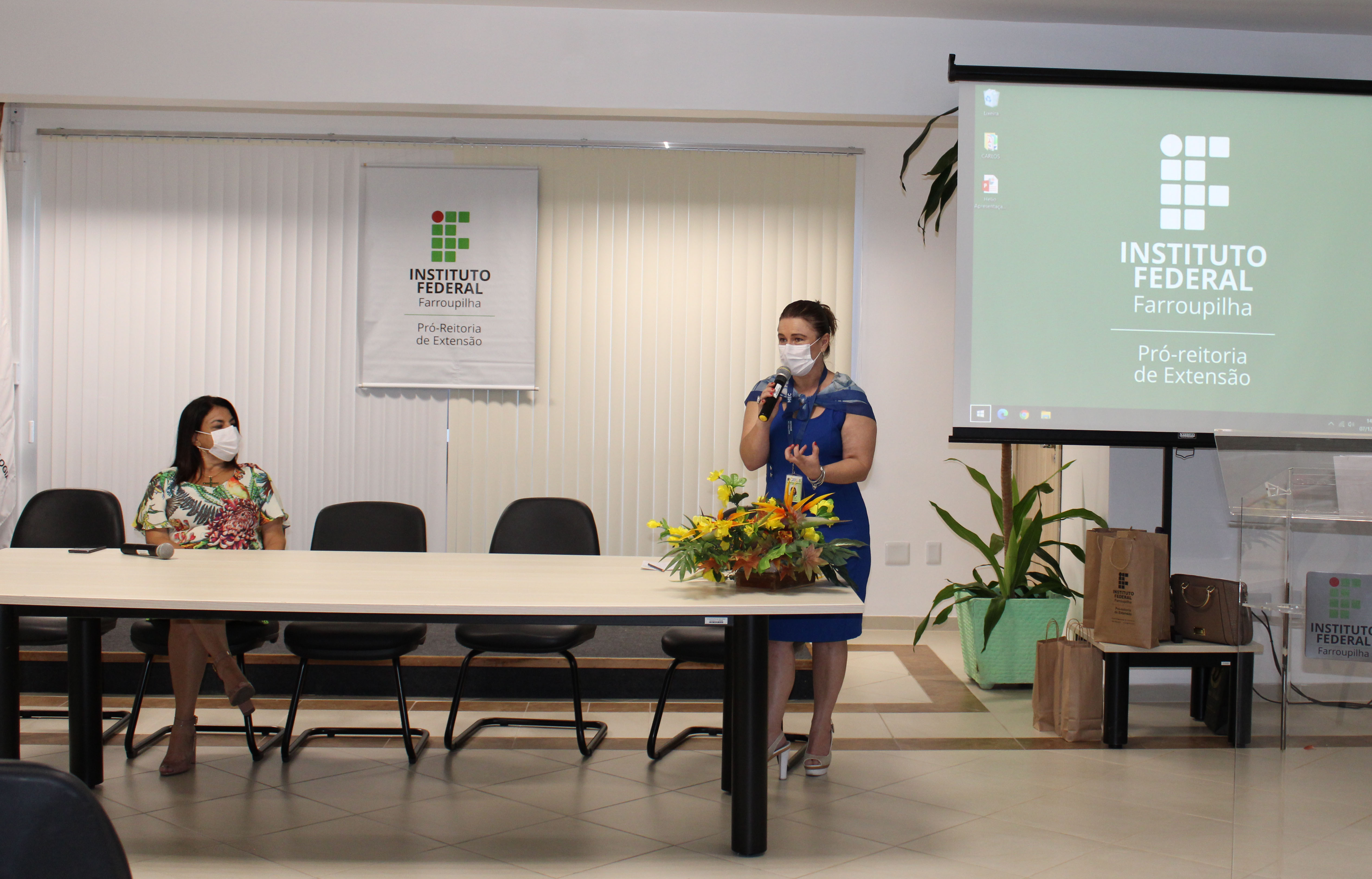A pró-reitora do IFFar, Angela Marinho (em pé), e a vice-reitora eleita da UFSM, Martha Adaime (sentada), coordenaram o evento.