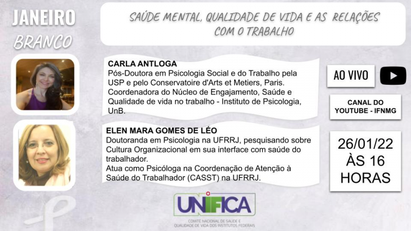 A atividade é alusiva ao Janeiro Branco, que tem como objetivo a promoção da saúde mental. O evento terá interpretação de libras e emissão de certificado para todos que assistirem a live ao vivo.