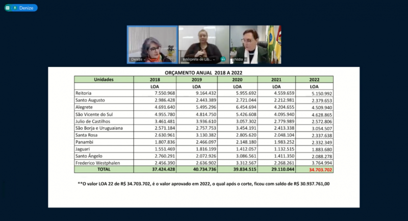 A primeira pauta da reunião extraordinária realizada pelo Conselho Superior (Consup) nesta manhã (4) foi a situação do IFFar após os cortes de 10,9% no orçamento, anunciados em junho pelo governo federal. São, no total, 3 milhões e 765 mil reais a menos do que o previsto na Lei Orçamentária Anual 2022 para o funcionamento dos campi até o final do ano. A redução fará com que todas as unidades do IFFar precisem ajustar o planejamento das atividades para este segundo semestre em relação ao que será ou não possível realizar.