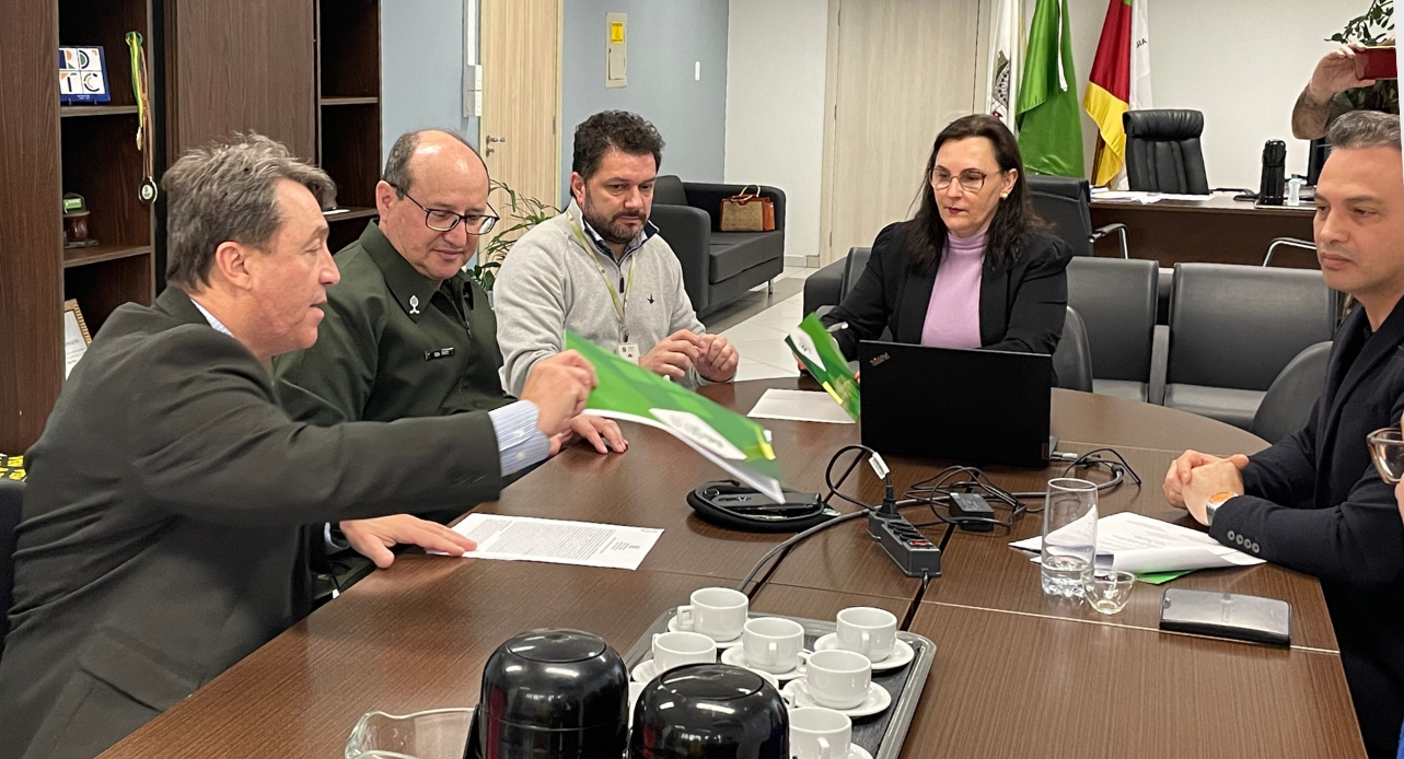 Foto: no centro, reitora do IFFar Nídia Heringer. À direita: Diretor de Extensão, Alcionir Pazatto Almeida; Coordenadora de Extensão Tecnológica, Ana Carla dos Santos Gomes; Diretora de Educação a Distância, Raquel Lunardi. À esquerda: General Sérgio Luiz Tratz e Coronel André Portela Batista, da 3ª Divisão do Exército.