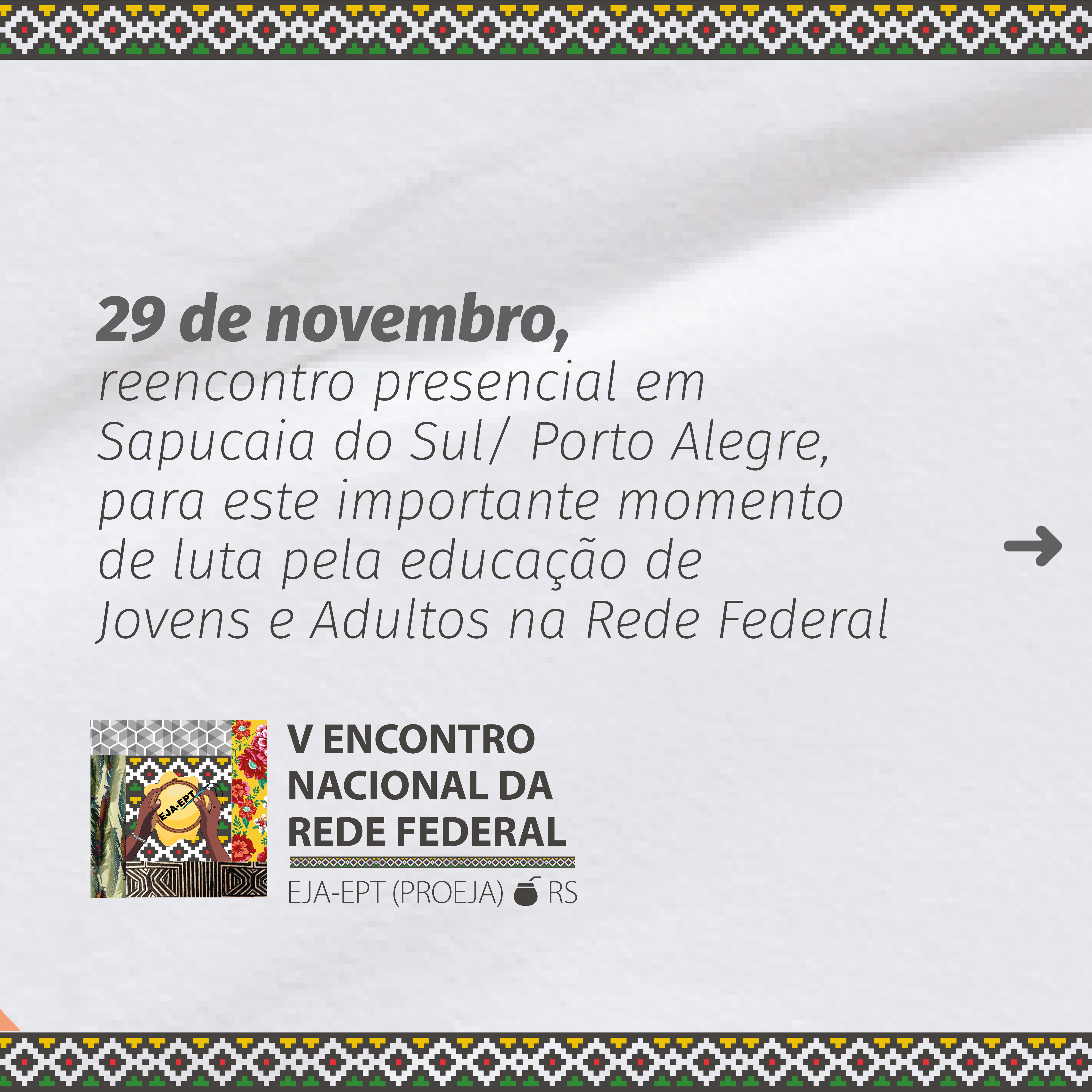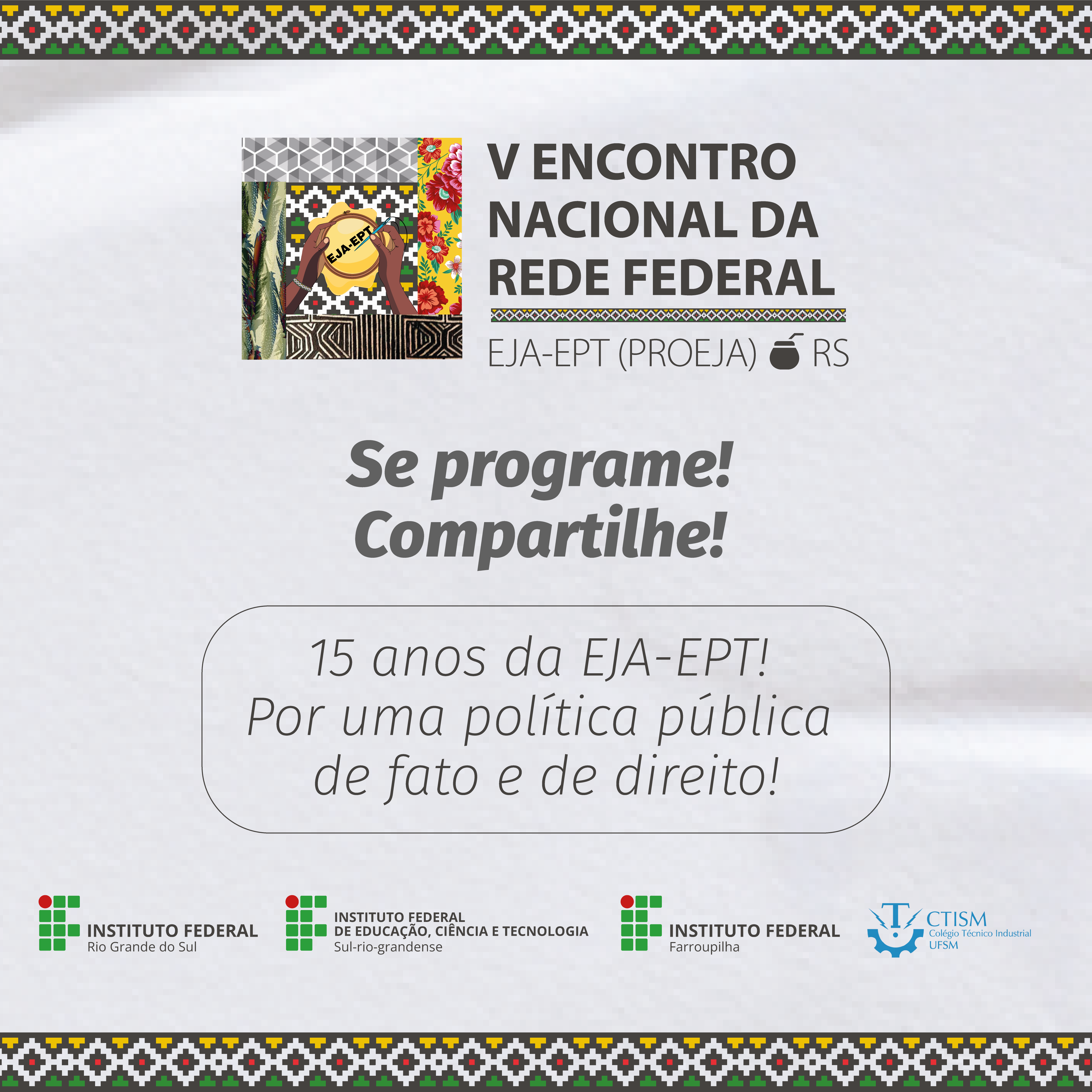Estão abertas as inscrições para o V Encontro Nacional EJA-EPT (PROEJA) da Rede Federal, que será realizado de 29 de novembro a 1º de dezembro, em Sapucaia do Sul. O tema será “15 anos da EJA-EPT: por uma política pública de fato e de direito”.