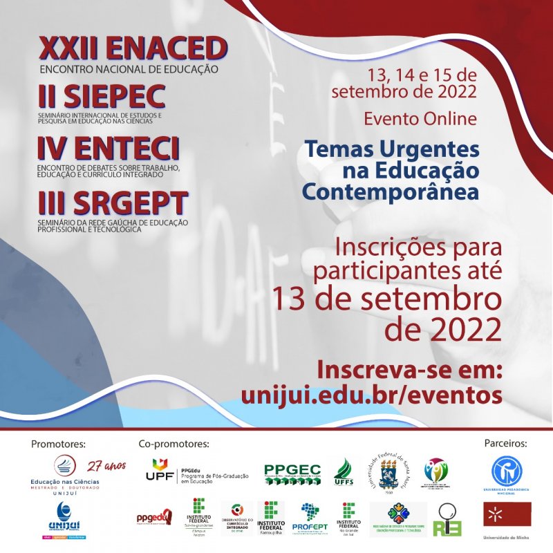 Com a proposta de discutir “Temas Urgentes na Educação Contemporânea”, durante os três dias de evento (13 a 15) serão realizados dois encontros e dois seminários. São eles: o XXII Encontro Nacional de Educação, o II Seminário Internacional de Estudos e Pesquisa em Educação nas Ciências, o IV Encontro de Debates Sobre Trabalho, Educação e Currículo Integrado e o III Seminário da Rede Gaúcha de Educação Profissional e Tecnológica. As inscrições podem ser realizadas nesta página.