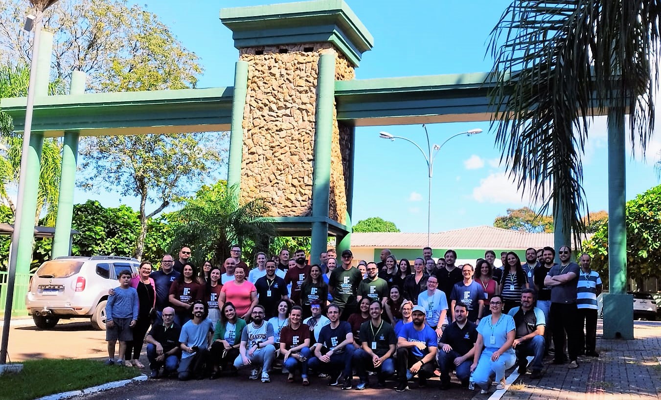 Servidores posam para foto no pórtico de entrada do Campus FW