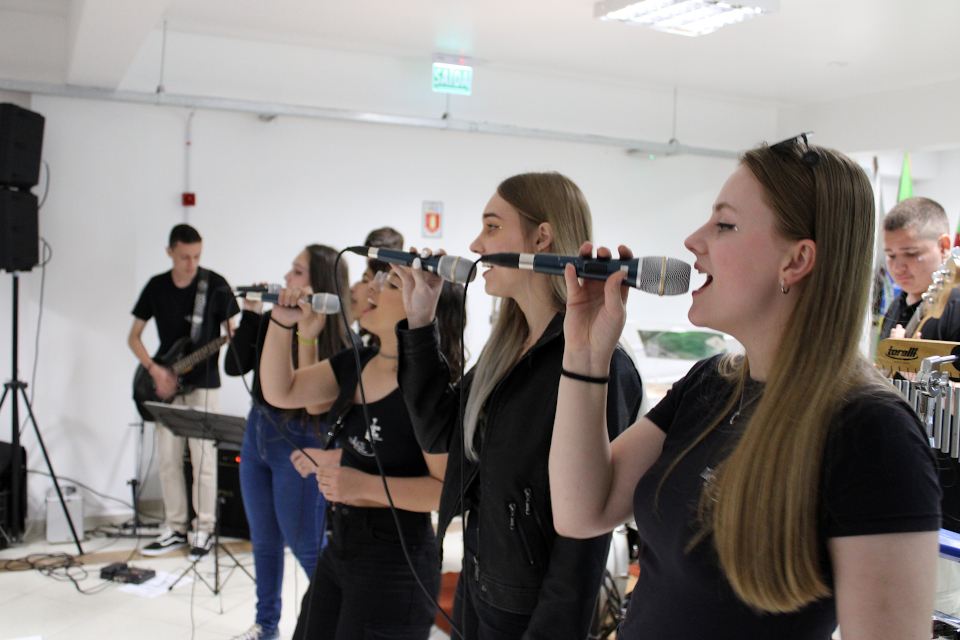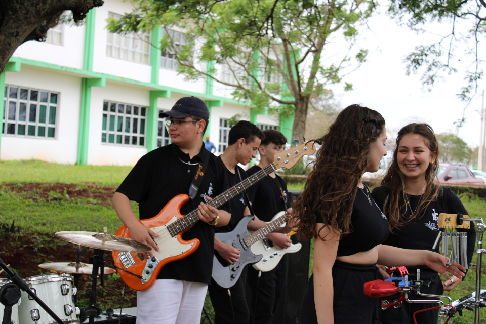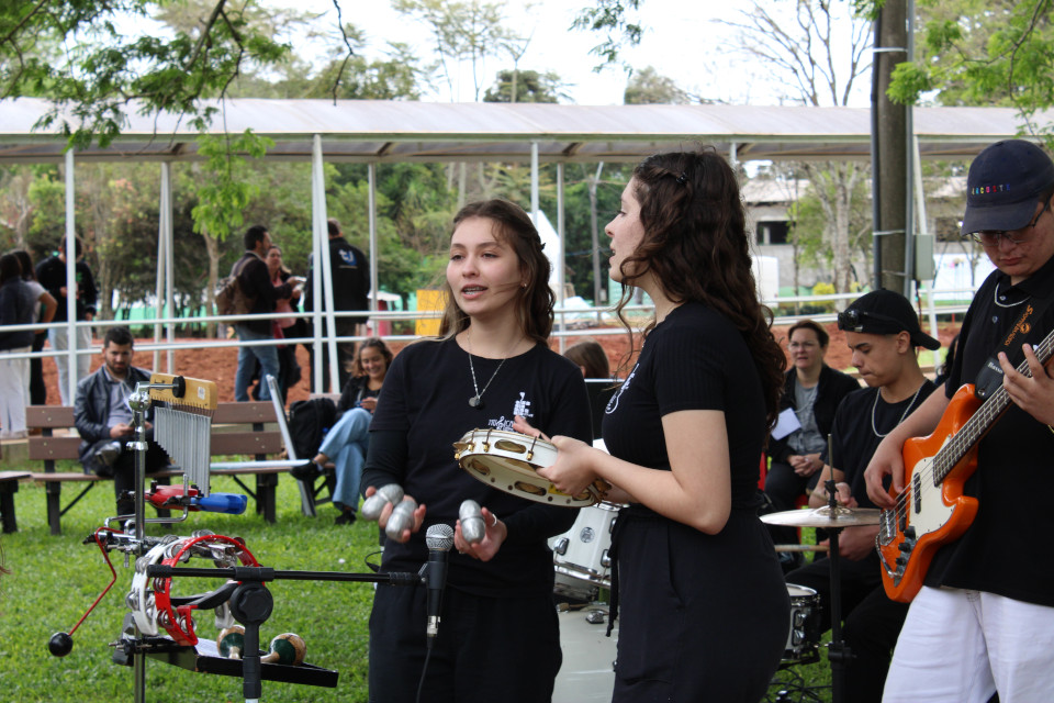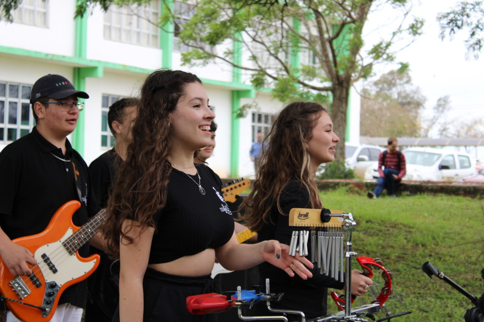A estudante do IFFar vê esse crescimento também nos colegas de banda. Uma das meninas cantava baixo, tinha muita vergonha. Os instrumentistas também tentavam se ocultar atrás das vocalistas. Depois, passaram a fazer firulas com os instrumentos. As percussionistas começaram a descer do palco, a brincar com o público, acolhendo a plateia.