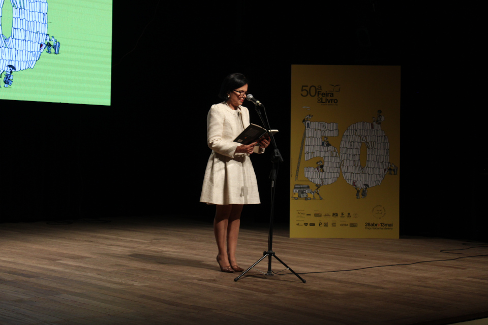 Secretária Adjunta de Cultura do Rio Grande do Sul, Gabriella Meindrad, fala durante abertura da Feira