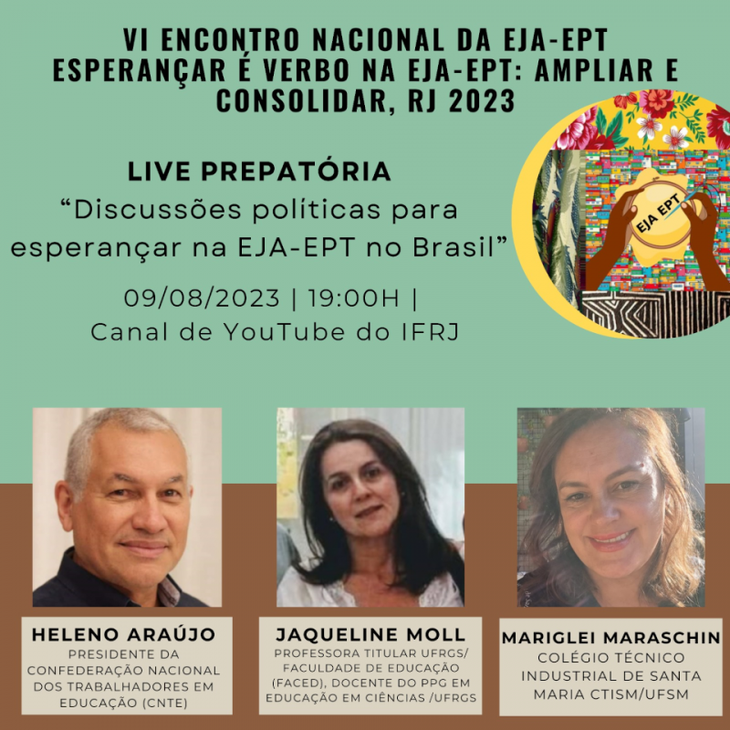 A live com o tema “Discussões políticas para esperançar na EJA-EPT no Brasil” ocorre nesta quarta-feira (9), a partir das 19h, com transmissão pelo Youtube. A palestra é um evento preparatório para o VI Encontro Nacional da Educação de Jovens e Adultos Integrada à Educação Profissional (EJA-EPT), que ocorre em outubro e está com inscrições abertas.