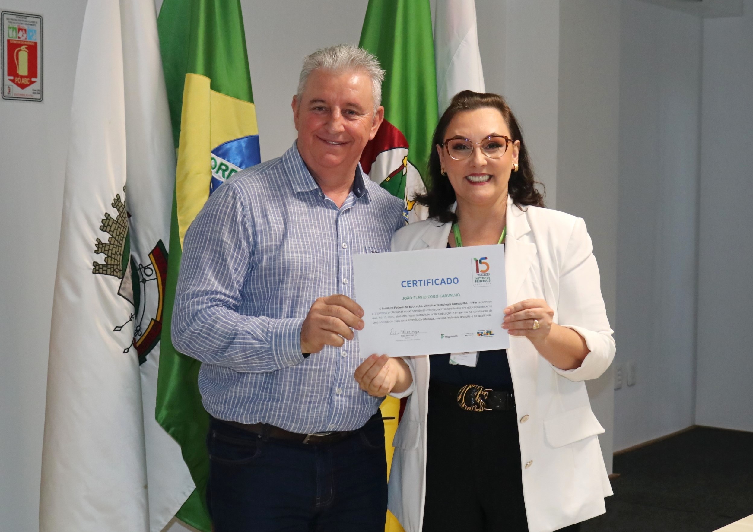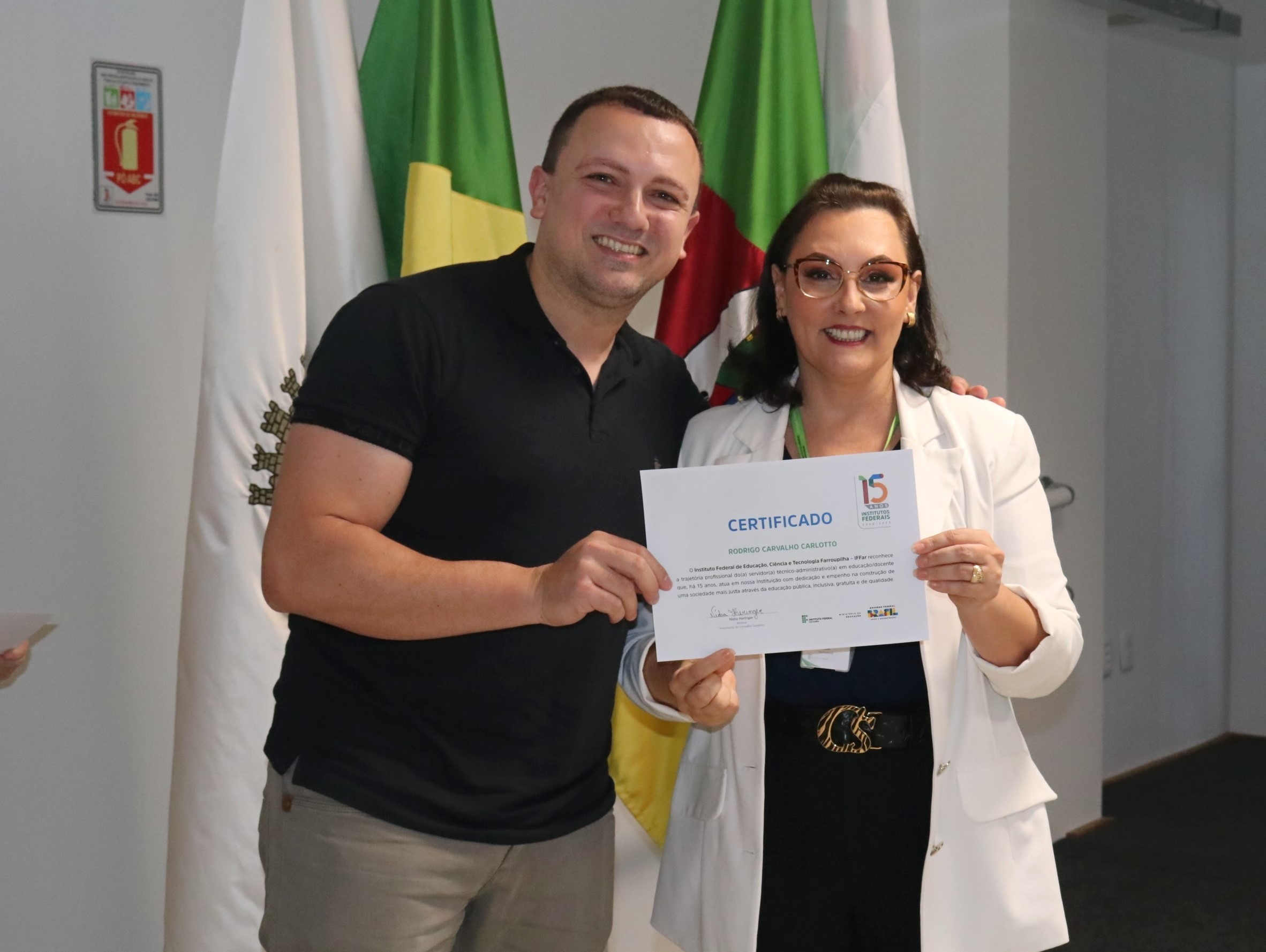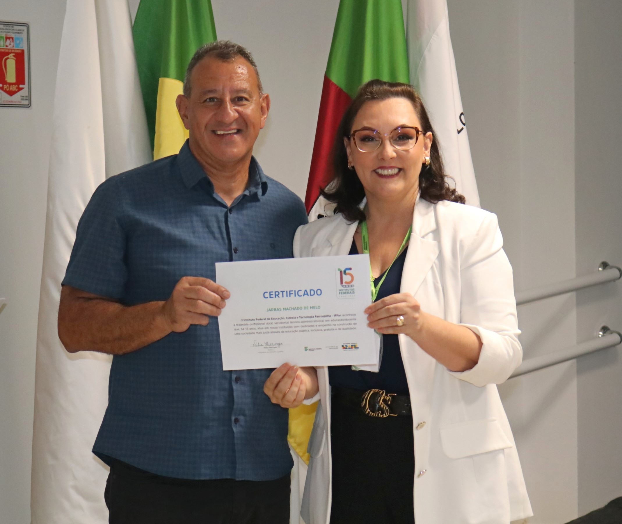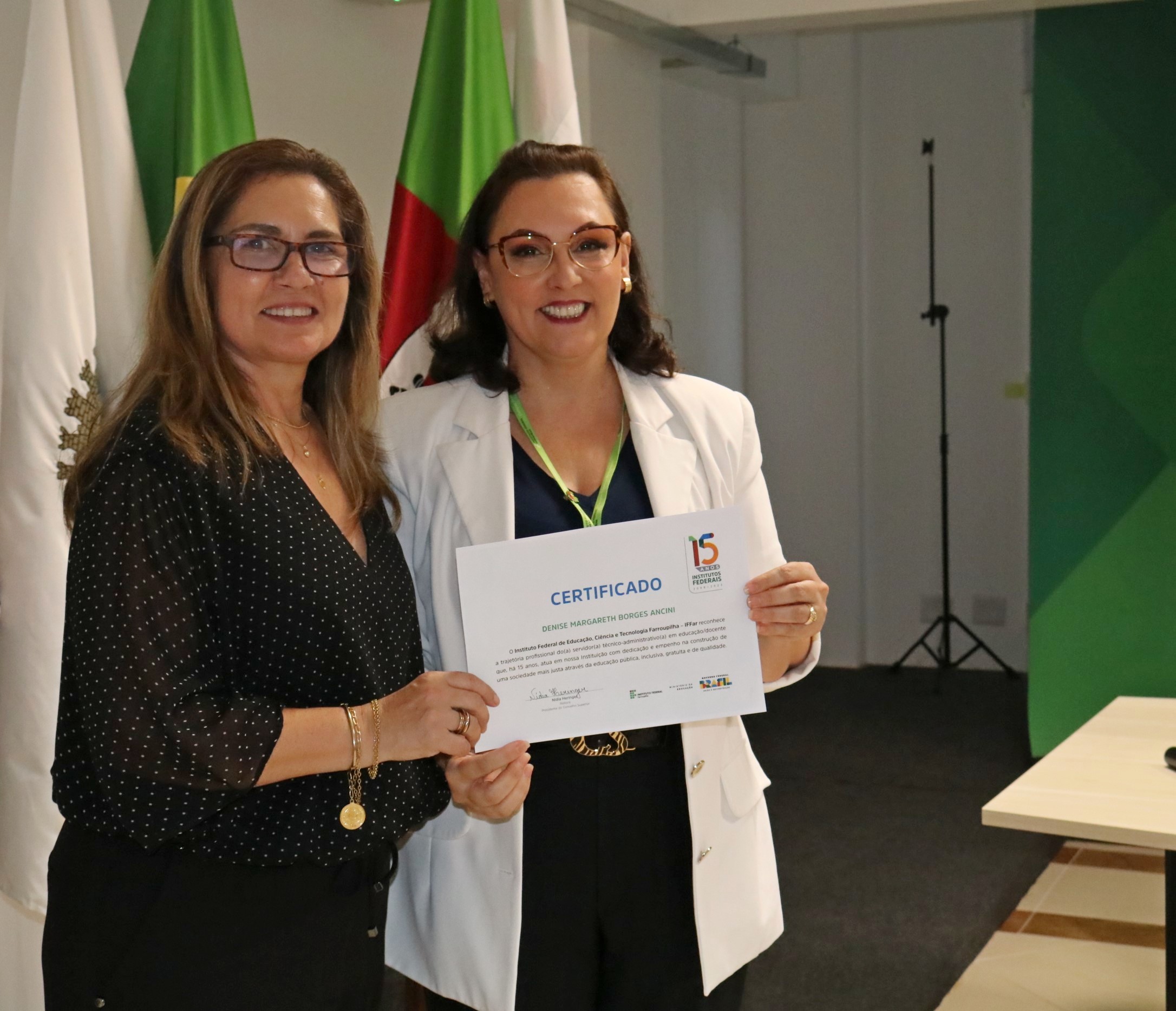 A ex-reitora do IFFar, professora Carla Jardim, recebeu um certificado como homenagem por ter atuado na Rede Federal desde a sua lei de criação. Outros membros do Conselho Superior que também atuam há 15 anos receberam certificados*: