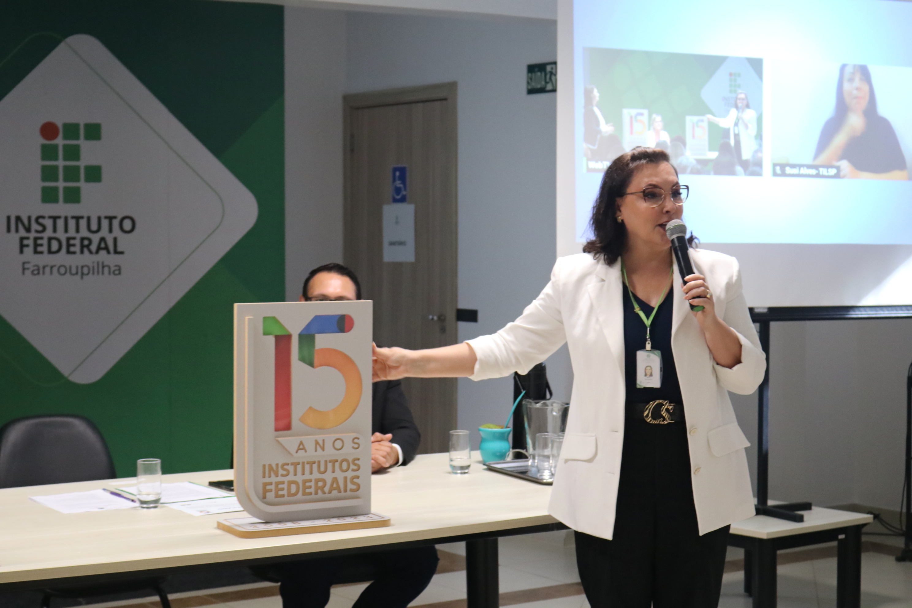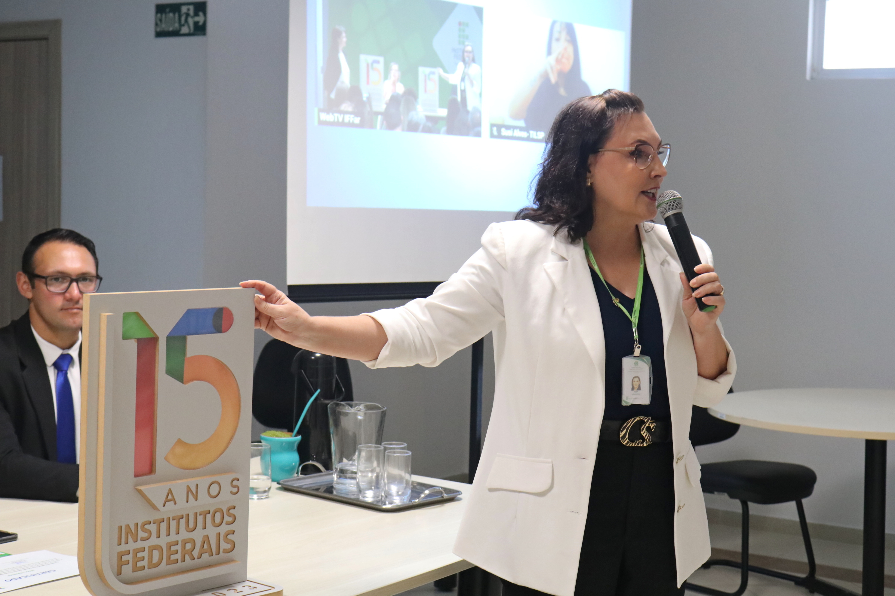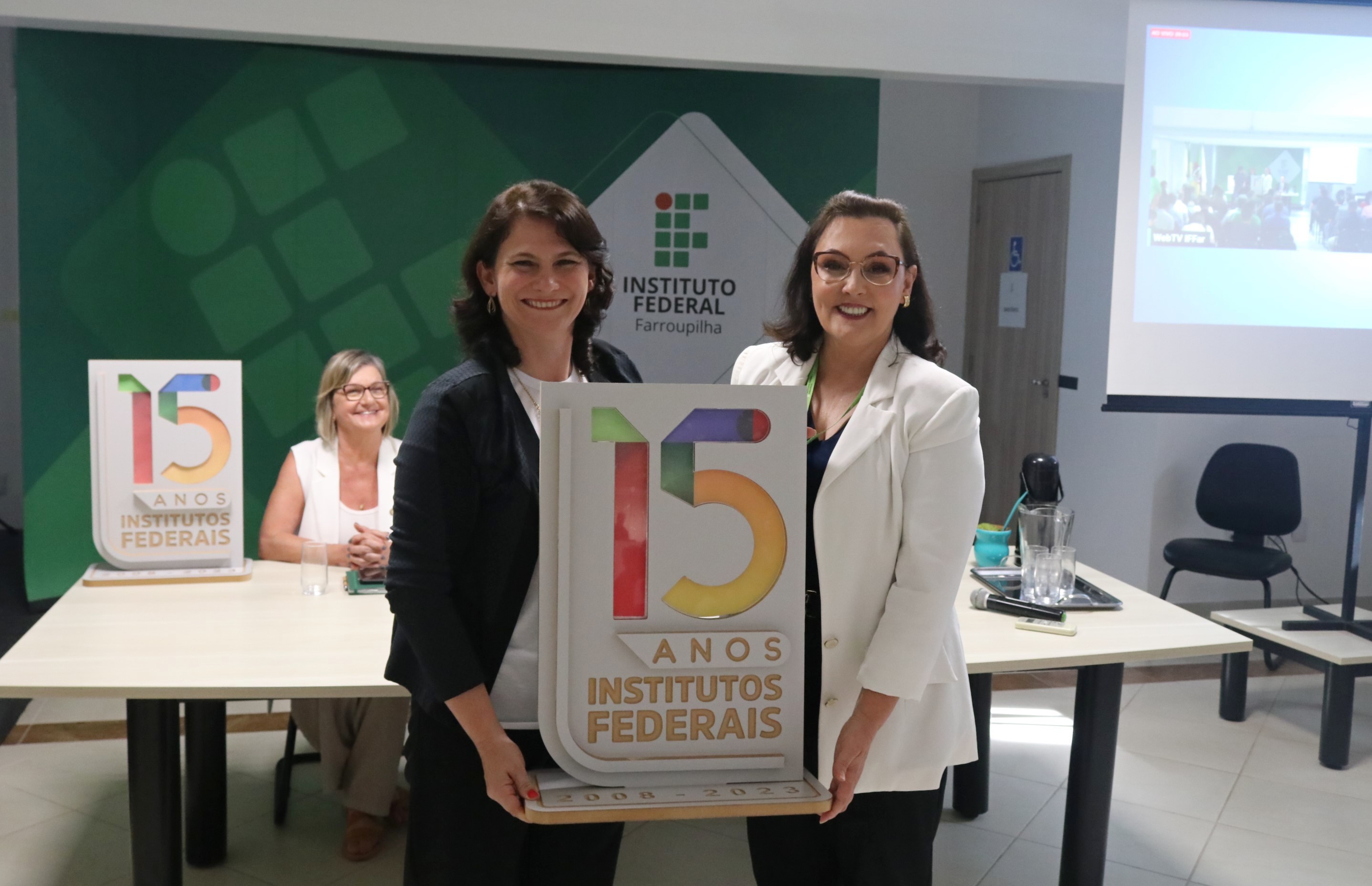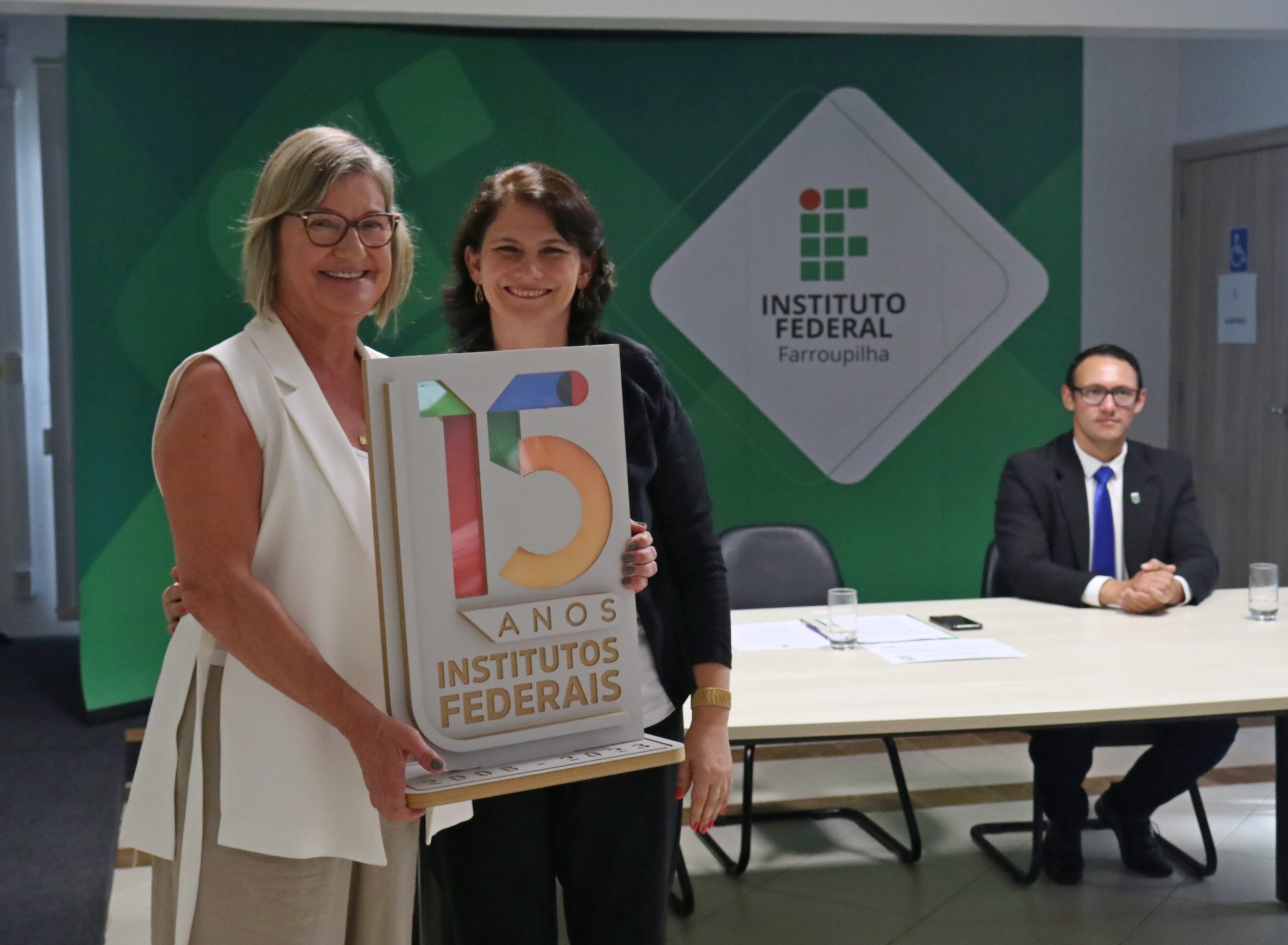 Foto: reitora do IFFar e diretora-geral do Campus Santa Rosa seguram placa com a logo dos 15 anos dos IFs