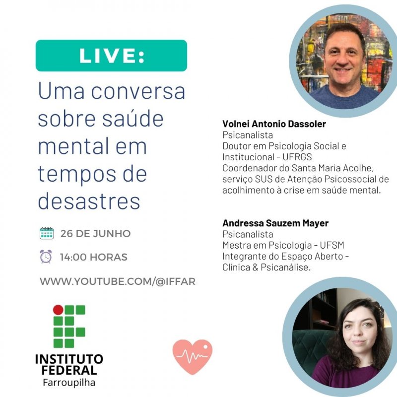 A live “Uma conversa sobre saúde mental em tempos de desastres” ocorre nesta quarta-feira (26), a partir das 14h. O evento é aberto a todos os interessados e será transmitido pelo canal da WebTV do IFFar no Youtube.