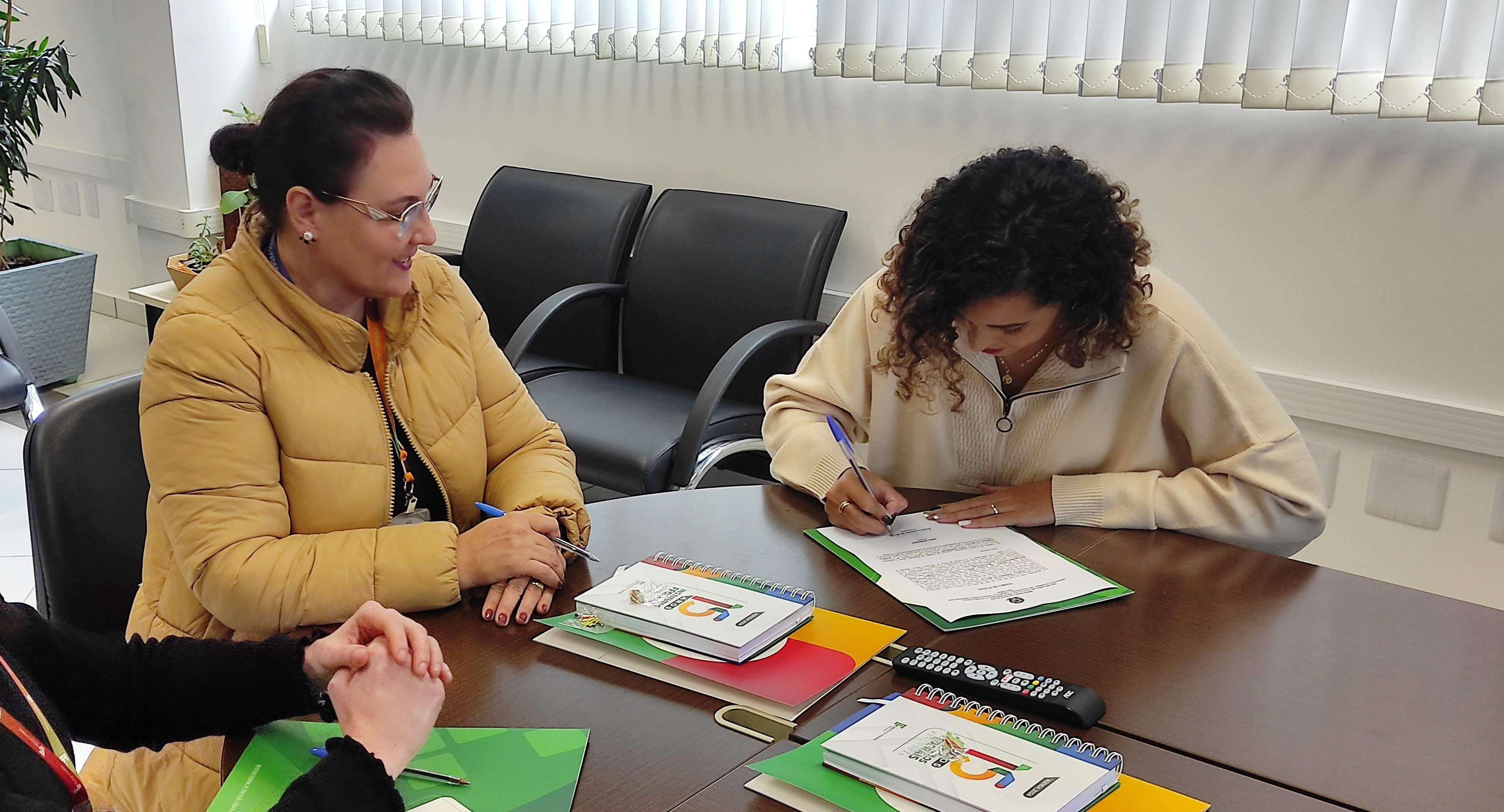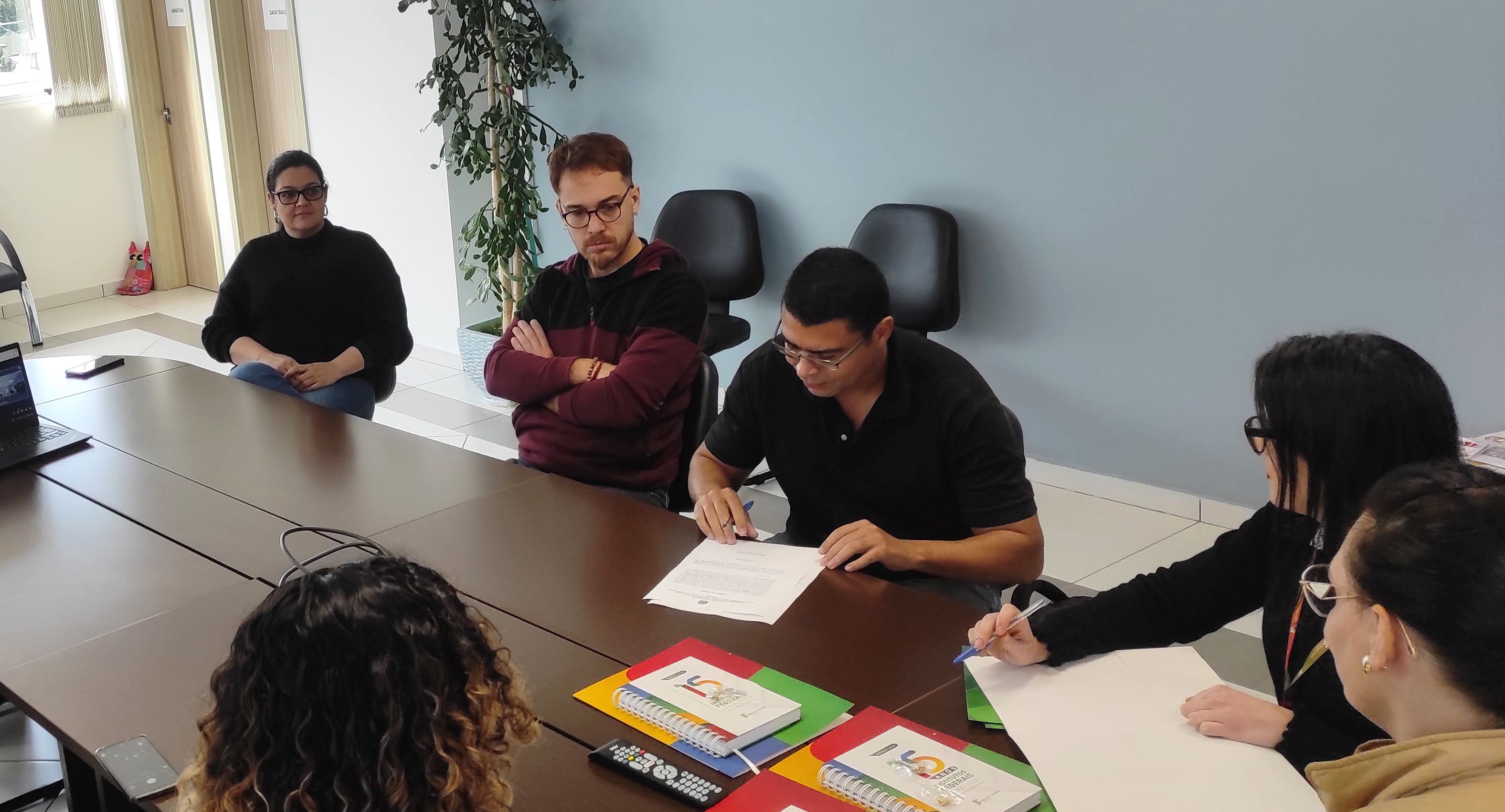 Foto: a assinatura do termo de posse teve a presença da reitora do IFFar (no centro, de jaqueta amarela) e do pró-reitor de Desenvolvimento Institucional (na direita, de crachá)