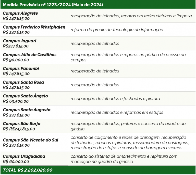 Confira abaixo como os valores de cada MP foram distribuídos entre os campi do IFFar.