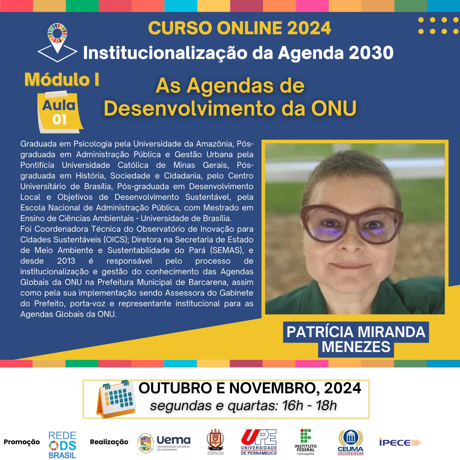 Professora: Patrícia Miranda Menezes. É psicóloga e mestre em Ensino de Ciências Ambientais pela Universidade de Brasília (UNB). Também possui especialização em Desenvolvimento Local e Objetivos de Desenvolvimento Sustentável pela Escola Nacional de Administração Pública (Enap). Atualmente é responsável pelo processo de institucionalização e gestão do conhecimento das Agendas Globais da ONU na Prefeitura Municipal de Barcarena (PA).