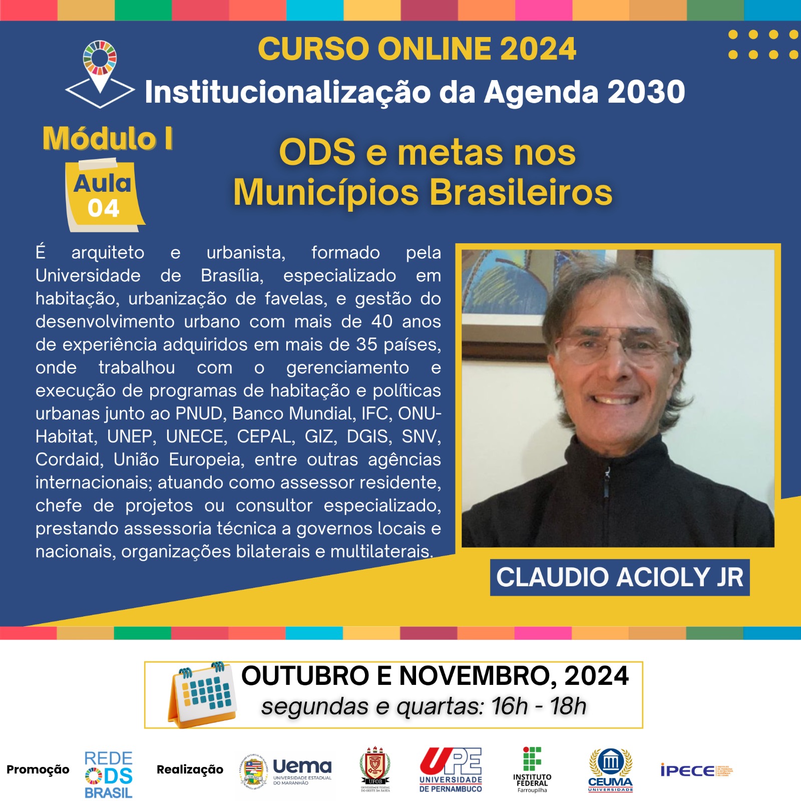 Professor: Claudio Acioly Jr. É arquiteto e urbanista especializado em habitação, urbanização de favelas e gestão do desenvolvimento urbano. Tem mais de 40 anos de experiência na área. Trabalhou em cerca de 35 países com o gerenciamento e execução de programas de habitação e políticas urbanas junto a organizações internacionais, como o PNUD, o Banco Mundial e a União Europeia.