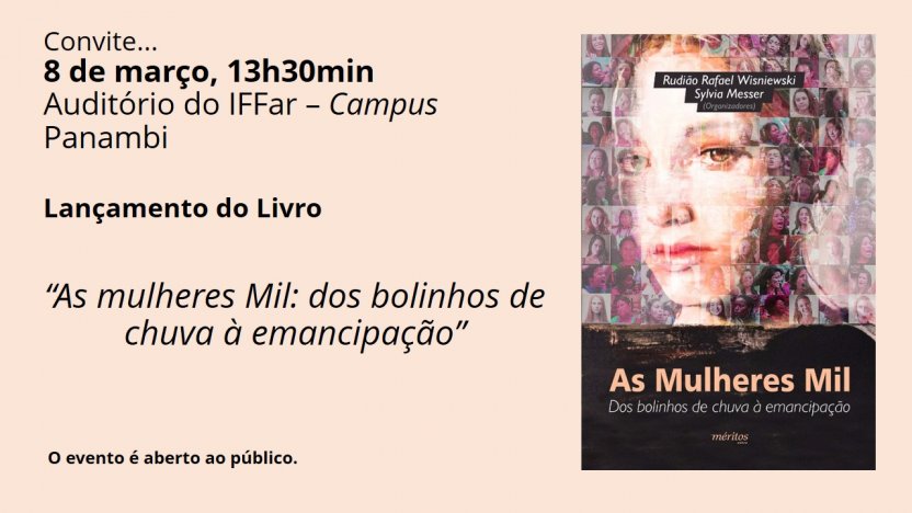 No dia 8 de março é celebrado o Dia Internacional da Mulher. Neste ano o IFFar – Campus Panambi tem a honra de convidar a toda comunidade local para o lançamento do livro “As Mulheres Mil: dos bolinhos de chuva à emancipação”.