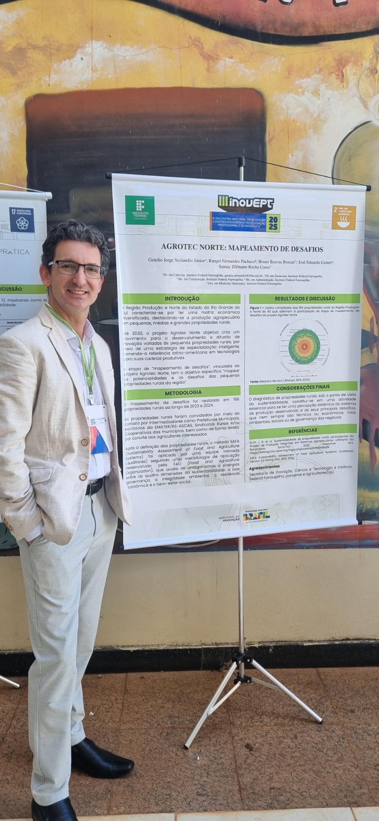 No campo da sustentabilidade, o professor Getúlio Jorge Stefanello Júnior, pró-reitor de Extensão, compartilhou os resultados do projeto “Agrotec Norte: mapeamento de desafios”, desenvolvido em parceria com a UPF, URI/FW e o IFFar, Campus Frederico Westphalen. A iniciativa utilizou a metodologia SAFA, da FAO/ONU, para avaliar indicadores de sustentabilidade em 166 propriedades rurais do norte do Rio Grande do Sul, reforçando o papel da educação pública na construção de práticas agrícolas mais responsáveis.