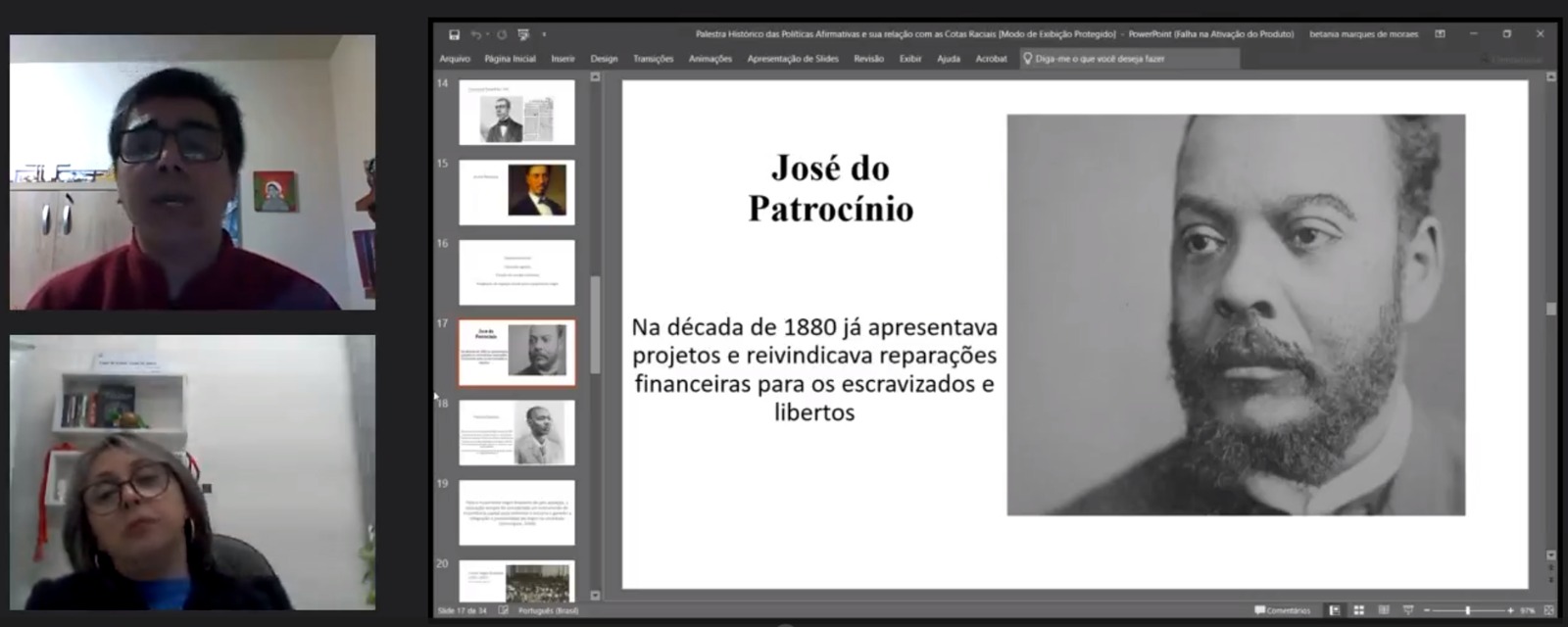 O primeiro encontro teve como tema “Histórico das Políticas Afirmativas e sua relação com as Cotas Raciais” e foi conduzido pelo professor Márcio Sônego, servidor do campus Alegrete, onde atua na Coordenação de Ações Afirmativas e nos núcleos inclusivos, principalmente no NEABI (Núcleo de Estudos Afro-Brasileiros e Indígenas). A atividade foi dividida em dois momentos: no primeiro, discutiu-se a importância das ações afirmativas no Brasil; no segundo, foi apresentada uma breve trajetória das ideias e projetos de reparação propostos pelos movimentos sociais negros ao longo da história.