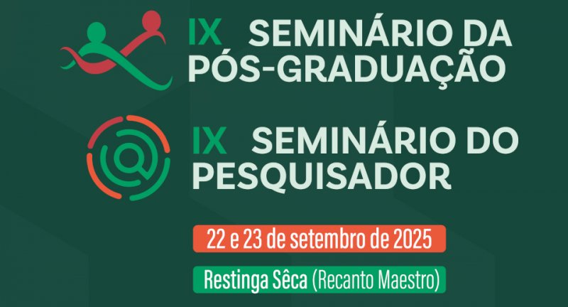 As inscrições para o IX Seminário da Pós-Graduação e o IX Seminário do Pesquisador do IFFar terminam nesta segunda-feira, 25 de agosto. Os eventos ocorrem no final de setembro, em Restinga Sêca, com participação presencial e online. Confira a programação.