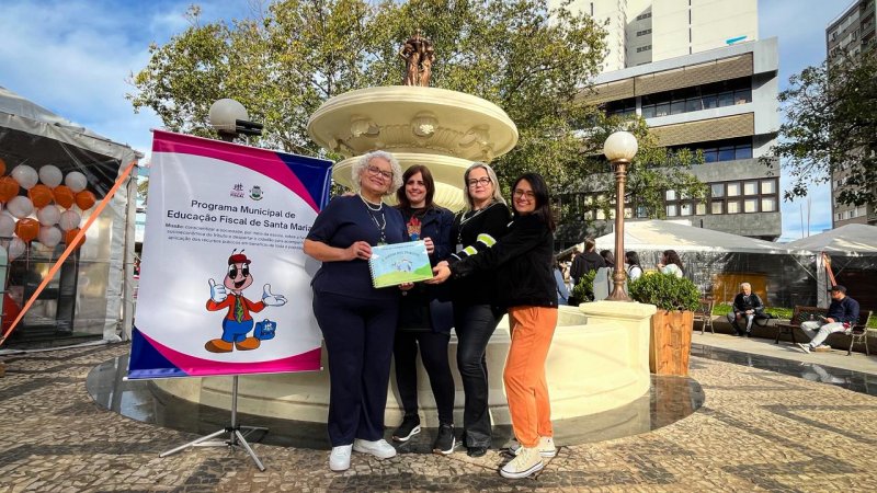 Durante a 52ª Feira do Livro de Santa Maria, na Praça Saldanha Marinho, Cristina Helena Bento Farias, coordenadora do Programa Municipal de Educação Fiscal da Prefeitura de Santa Maria; Betania Marques Moraes, revisora de braille do IFFar; Patricia Santos da Silva, educadora especial da SMED; e Letícia de Paula Zenker, representante do Comitê do Livro, Incentivo à Leitura e à Criação Literária da SMED, com a obra "O Jardim dos Tributos – Multiformato Acessível".