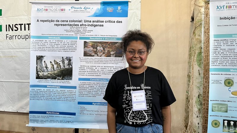 Tanandra Santos dos Santos, aluna do sexto semestre da Licenciatura em Química no Campus Alegrete, levou à mostra uma pesquisa que investiga a representatividade de comunidades afro-brasileiras e indígenas em livros didáticos aprovados pelo último Plano Nacional do Livro Didático (PNLD). Primeira da família a ingressar no ensino superior, ela conta que o estudo parte da análise de imagens e textos em materiais amplamente utilizados na rede pública, com base nas Leis nº 10.639/2003 e nº 11.645/2008.