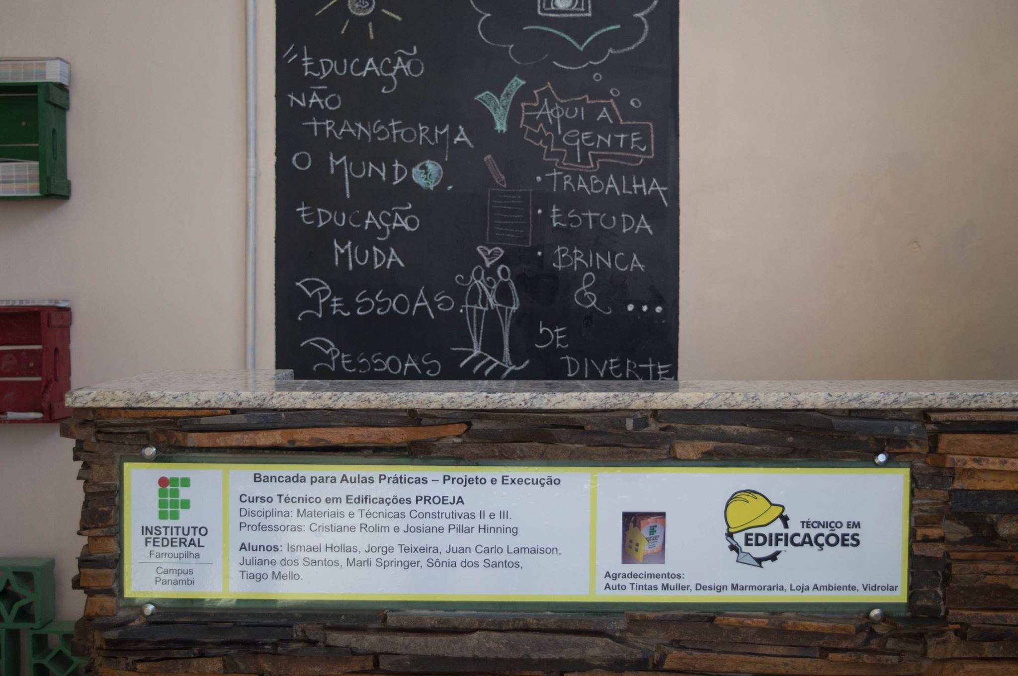 Na primeira etapa do projeto, foi construída uma bancada para aulas práticas com apoio e doação de materiais de acabamentos. Atualmente, está em fase de desenvolvimento o cadastro de empresas e autônomos que atuam na construção civil, o qual será socializado com a comunidade externa por meio de um portal. Com previsão de conclusão em 2018, o projeto conta com o apoio do IF Farroupilha para o seu desenvolvimento.