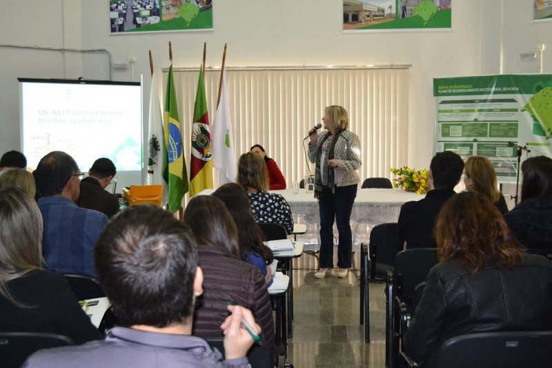 A palestrante convidada do 9º Seminário de Acolhida, Prof. Cláudia Schiedeck Soares de Souza, discutiu as dificuldades iniciais da criação dos IFs, bem como as oportunidades, ameaças e desafios da educação profissional na atualidade.