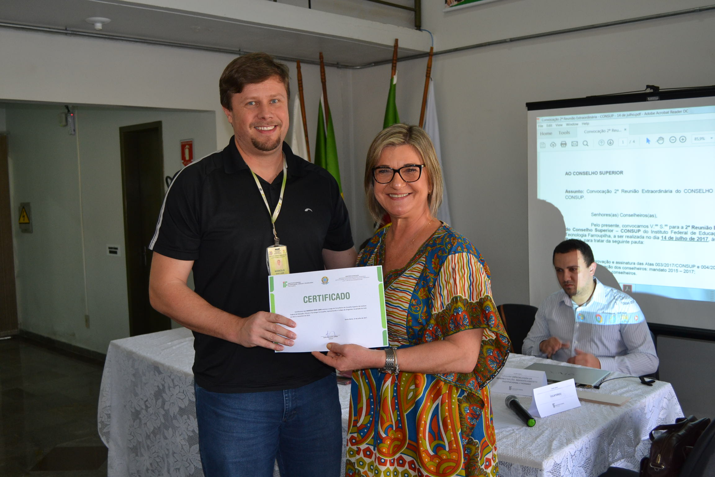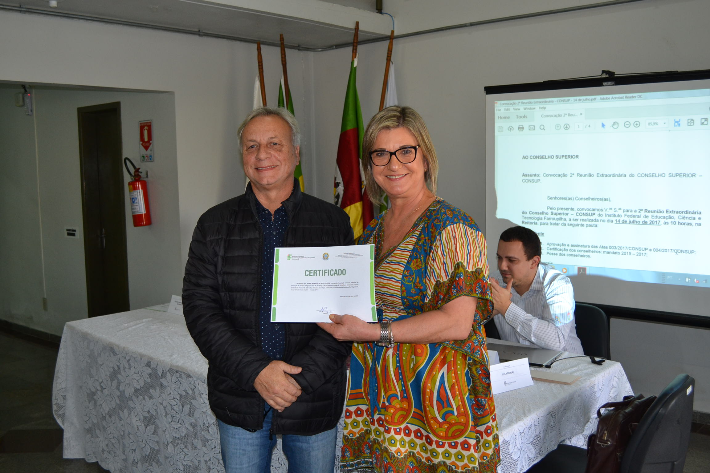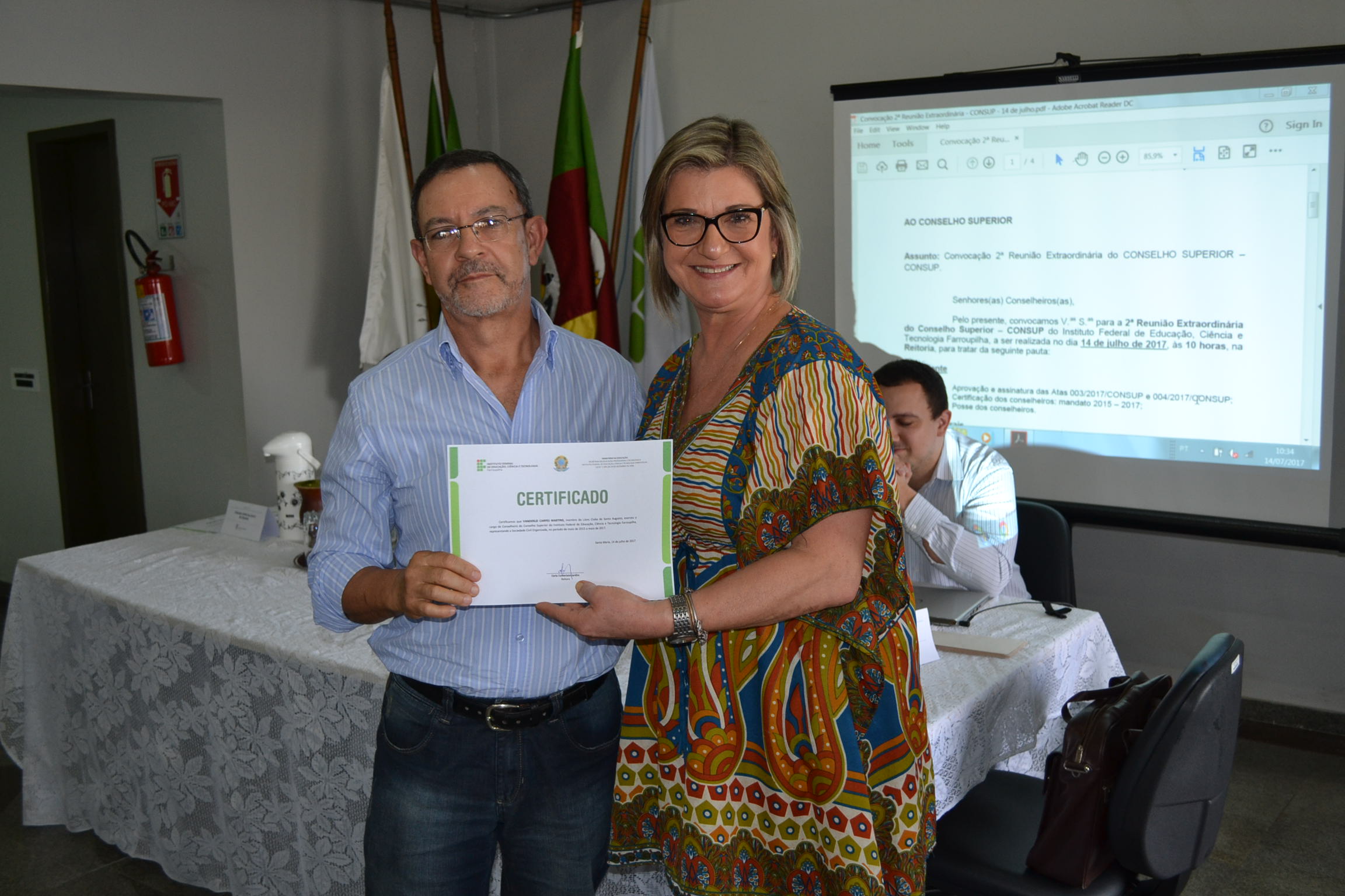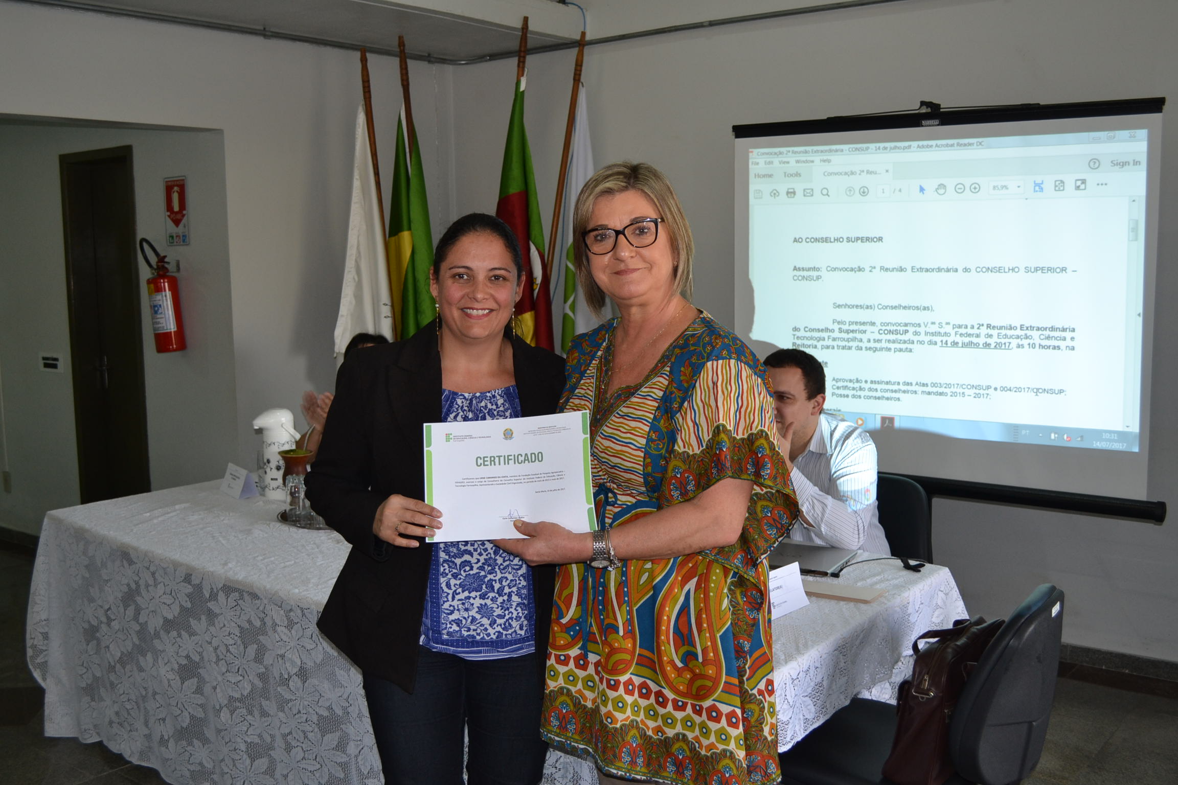 A segunda Reunião Extraordinária do Conselho Superior (Consup) é realizada nesta sexta-feira (14), na reitoria do IFFar. A primeira parte do encontro contou com a entrega de certificados de reconhecimento para todos os conselheiros, efetivos ou suplentes, que contribuíram com o Consup de 2015 a 2017 e que, agora, encerram seus mandatos. Os que puderam estar presentes nesta data receberam a certificação da reitora, Carla Comerlato Jardim.