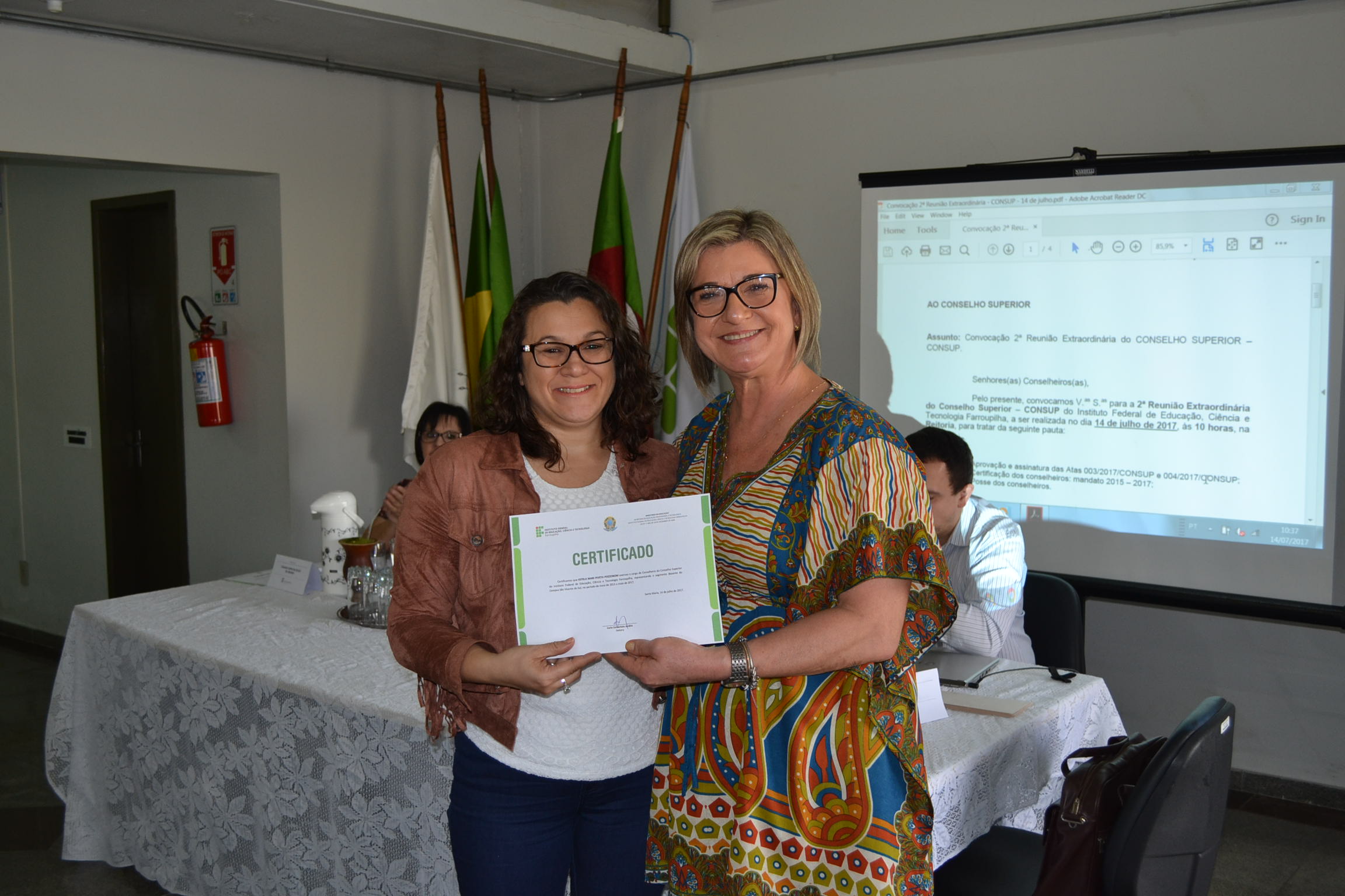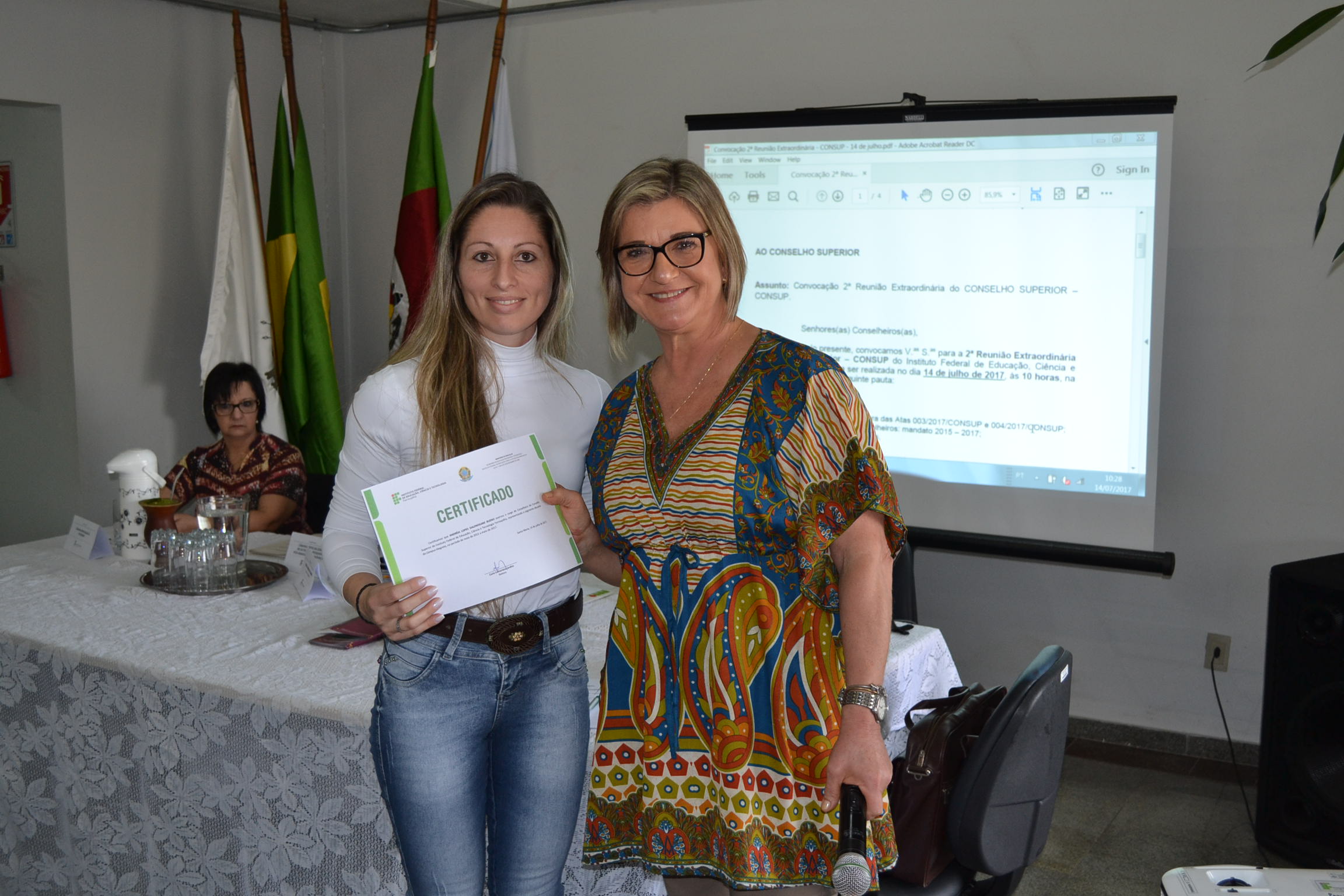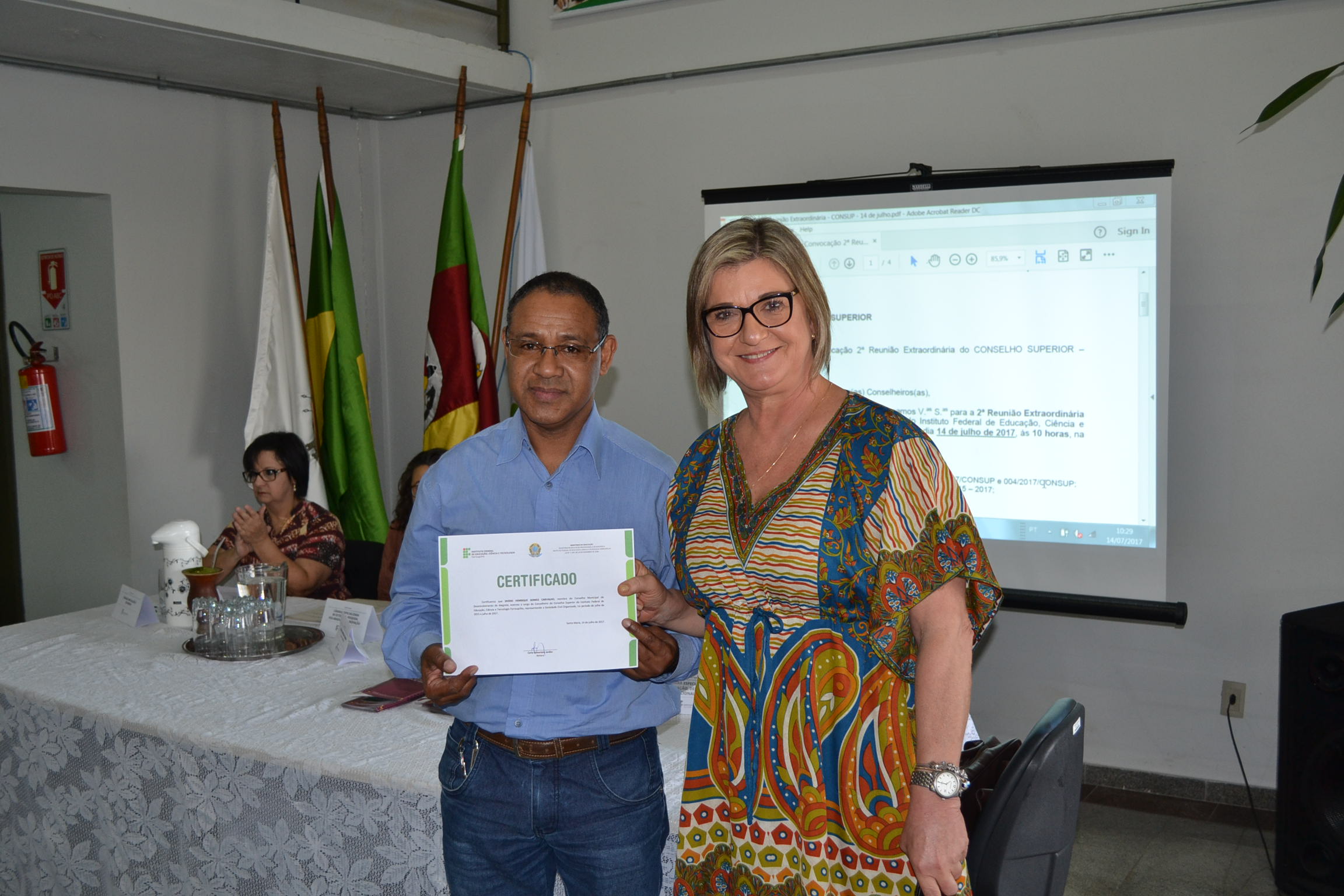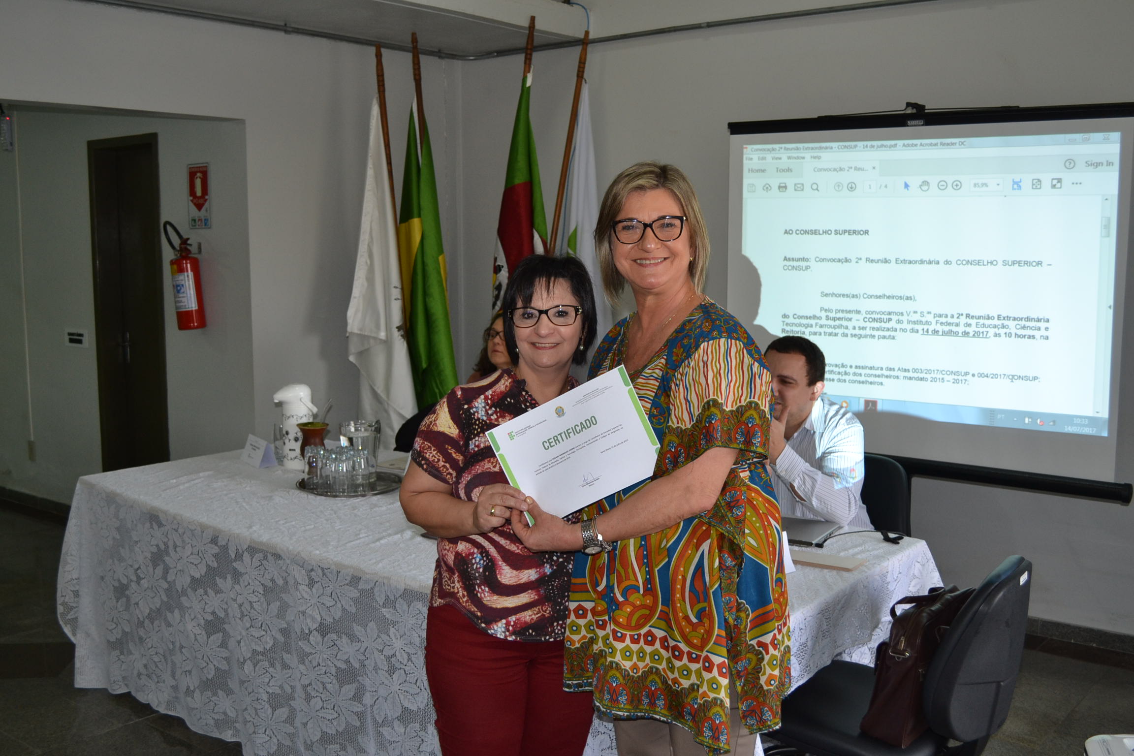 A segunda Reunião Extraordinária do Conselho Superior (Consup) é realizada nesta sexta-feira (14), na reitoria do IFFar. A primeira parte do encontro contou com a entrega de certificados de reconhecimento para todos os conselheiros, efetivos ou suplentes, que contribuíram com o Consup de 2015 a 2017 e que, agora, encerram seus mandatos. Os que puderam estar presentes nesta data receberam a certificação da reitora, Carla Comerlato Jardim.