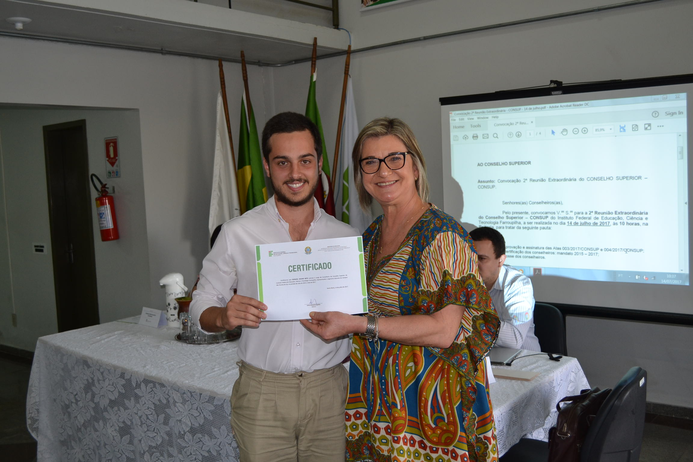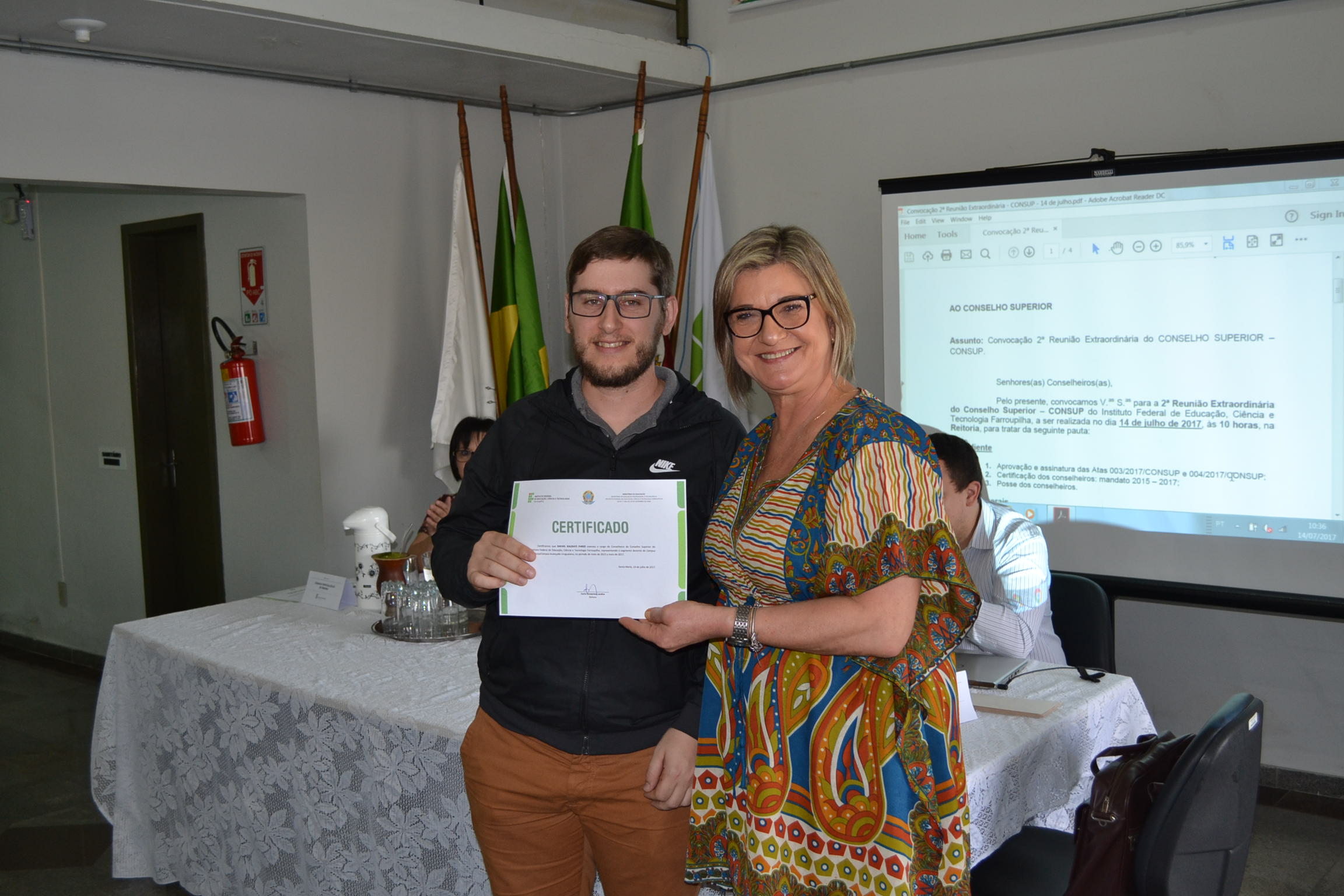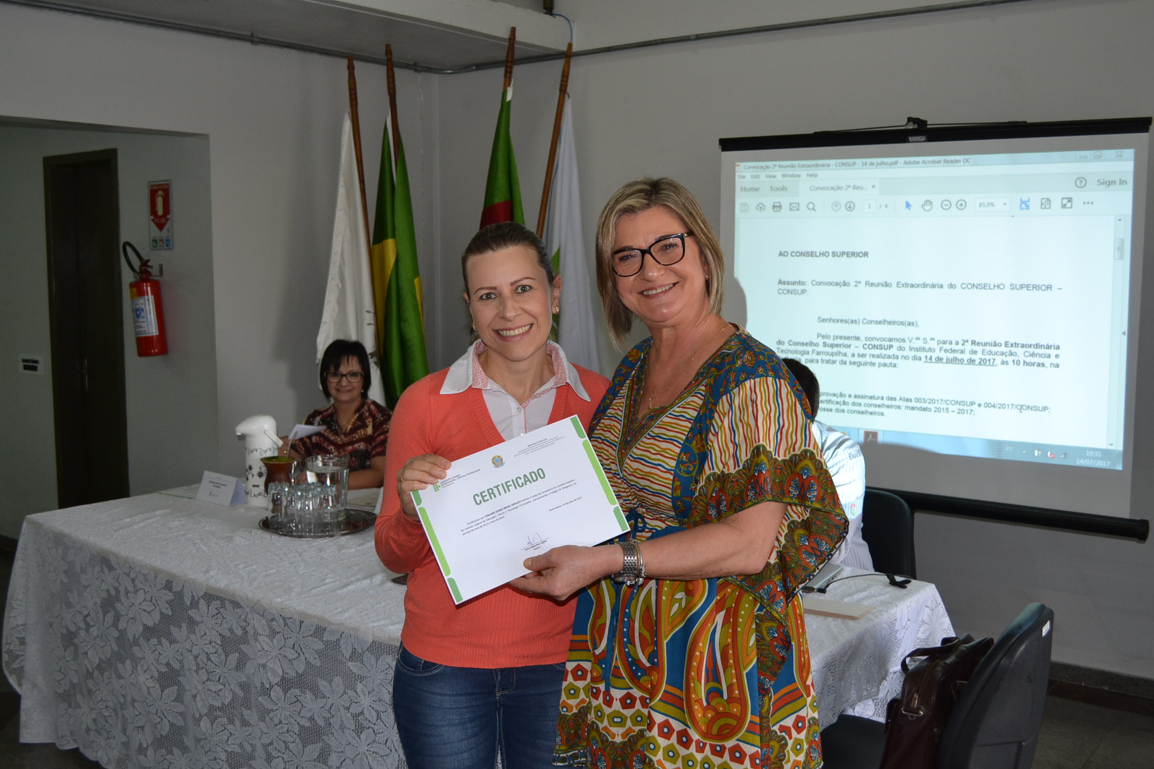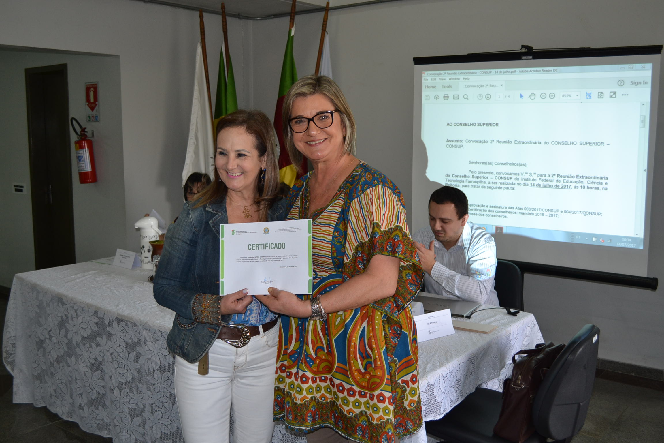 A segunda Reunião Extraordinária do Conselho Superior (Consup) é realizada nesta sexta-feira (14), na reitoria do IFFar. A primeira parte do encontro contou com a entrega de certificados de reconhecimento para todos os conselheiros, efetivos ou suplentes, que contribuíram com o Consup de 2015 a 2017 e que, agora, encerram seus mandatos. Os que puderam estar presentes nesta data receberam a certificação da reitora, Carla Comerlato Jardim.
