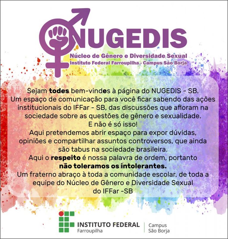 Página em rede social do Núcleo de Gênero e Diversidade Sexual (Nugedis) do IFFar – Campus São Borja traz conteúdos semanais sobre a temática. Ideia é levar discussões para fora do ambiente escolar utilizando linguagem familiar aos jovens.