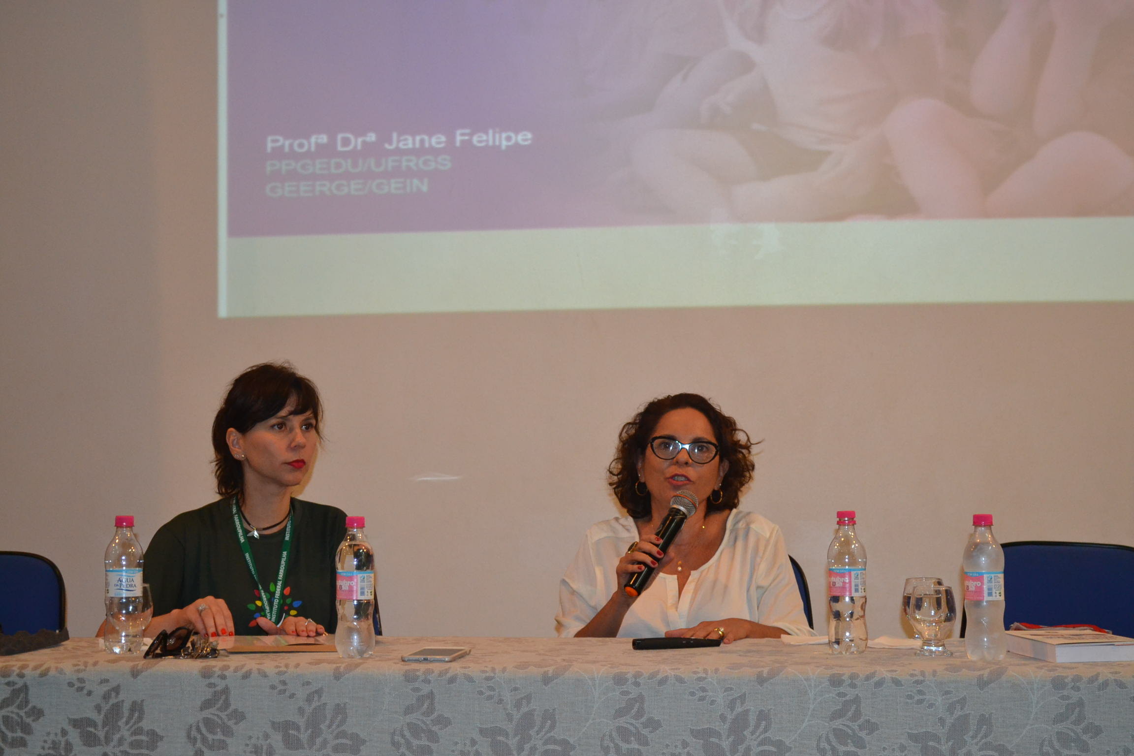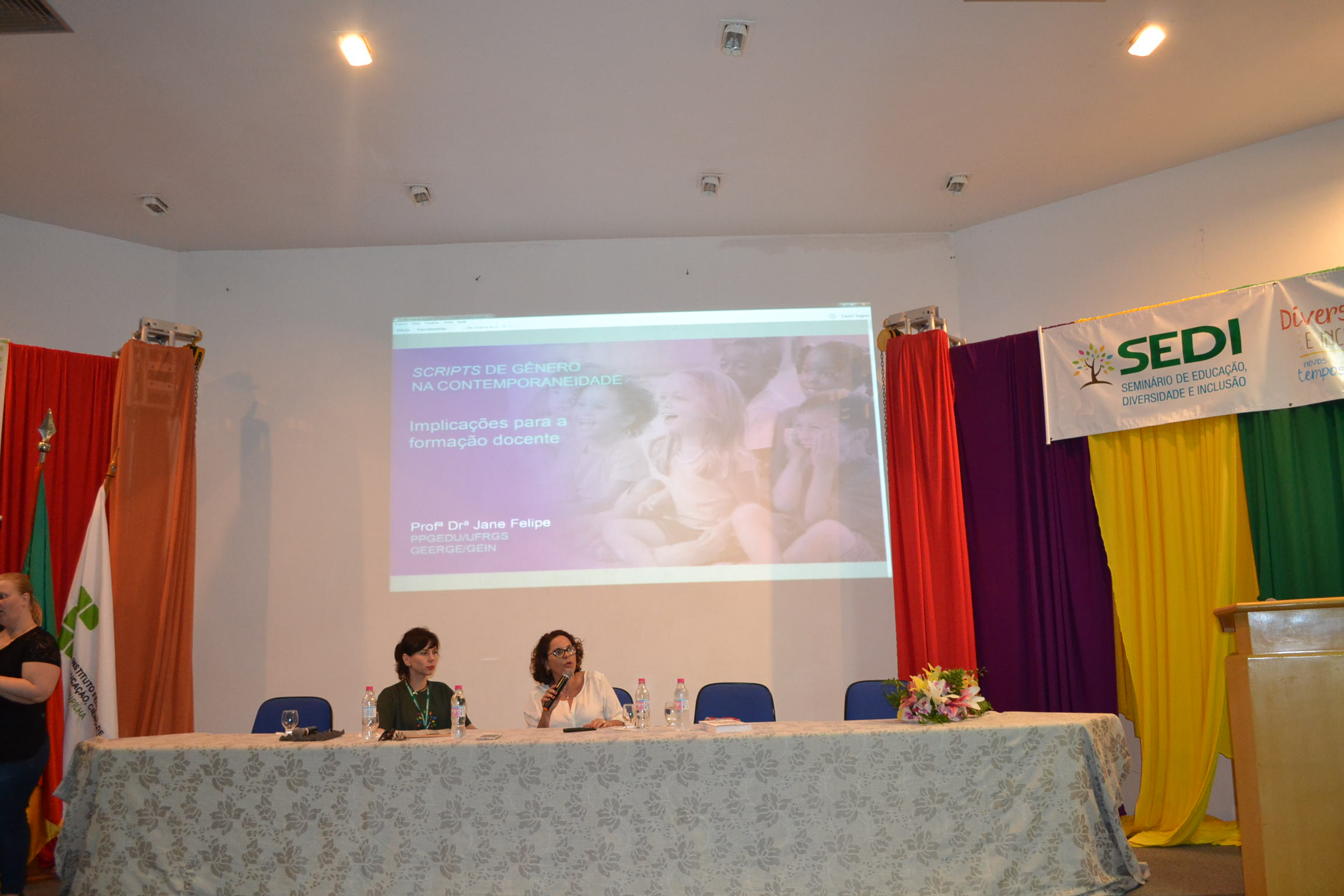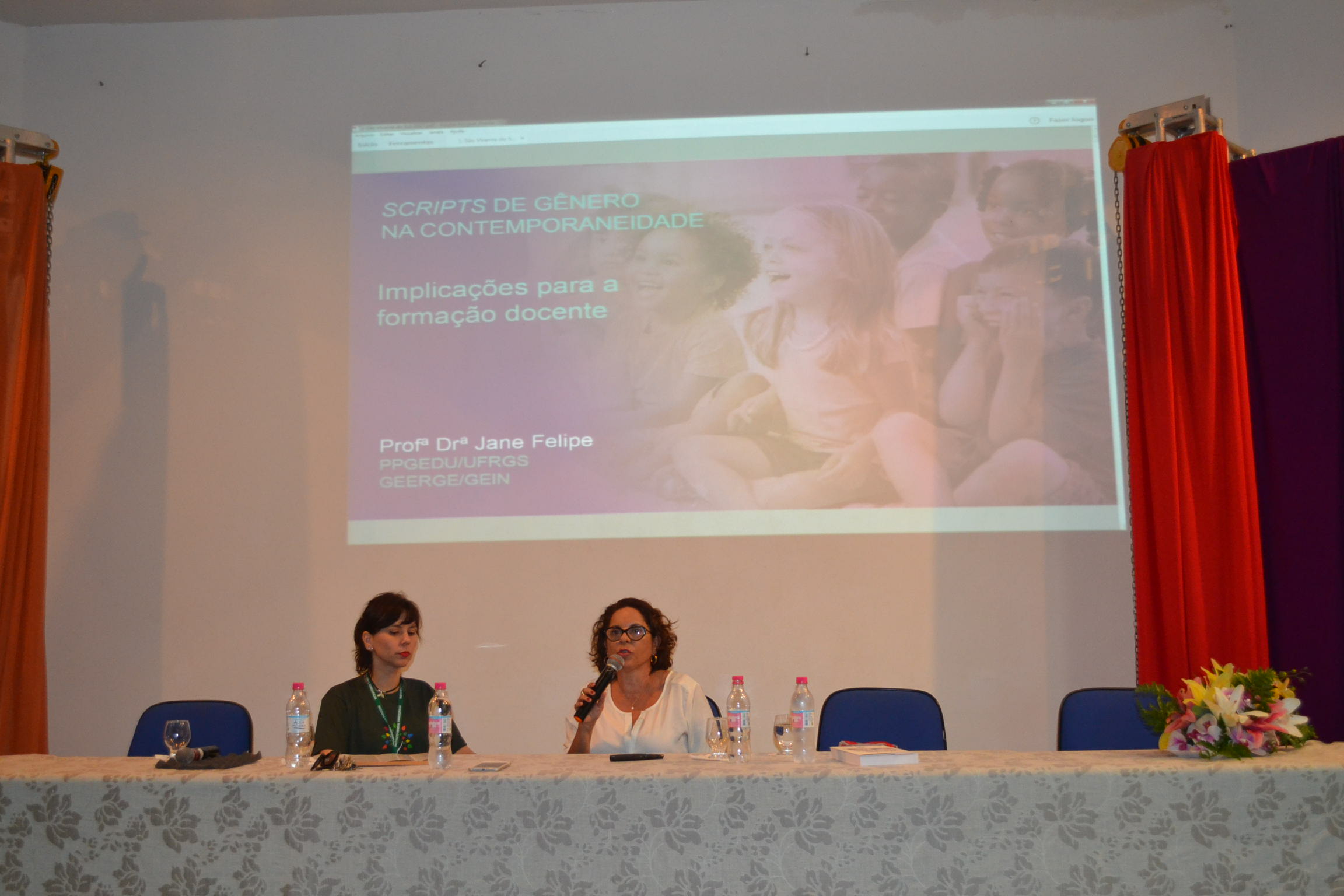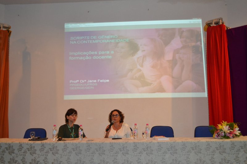 A primeira palestrante da tarde foi a professora Jane Felipe de Souza, que trouxe o tema "Scripts de gênero na contemporaneidade: implicações para a formação docente". A professora falou sobre os scripts destinados para cada gênero, ou seja, normatizações definidas socialmente sobre o que é esperado em relação às meninas e aos meninos. Introduziu ainda o conceito de "pedofilização" enquanto uma prática social contemporânea, que ganha, ainda mais força, através da espetacularização promovida pela mídia. Jane mencionou exemplos de como a infância é tratada como um fetiche, levando à erotização dos corpos infantis e banalizando o assédio. Para ela, "a escola precisa discutir sobre gênero, pois tem o compromisso de formar cidadãos e defender os direitos humanos. Por isso, torna-se tão importante o investimento na formação docente".