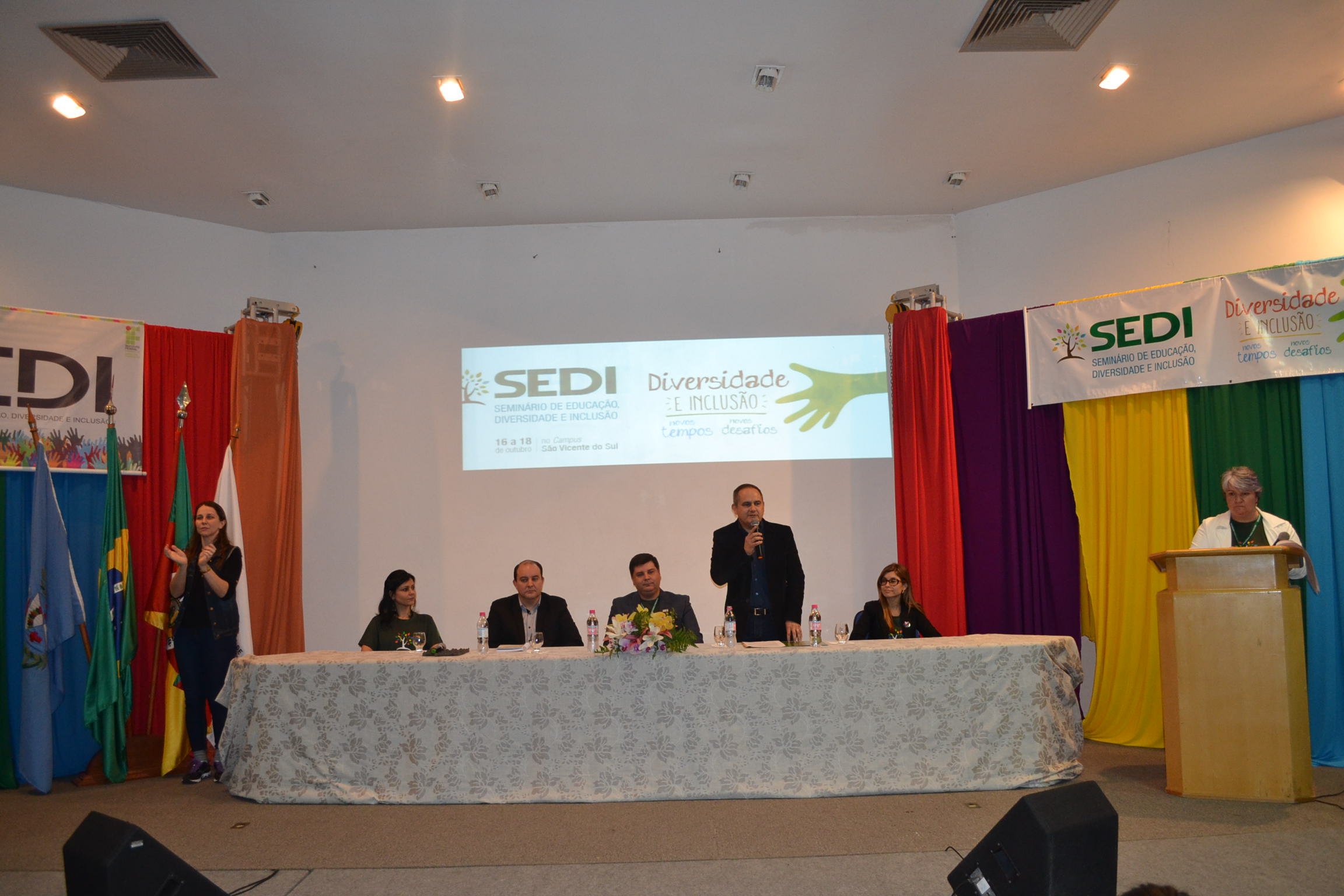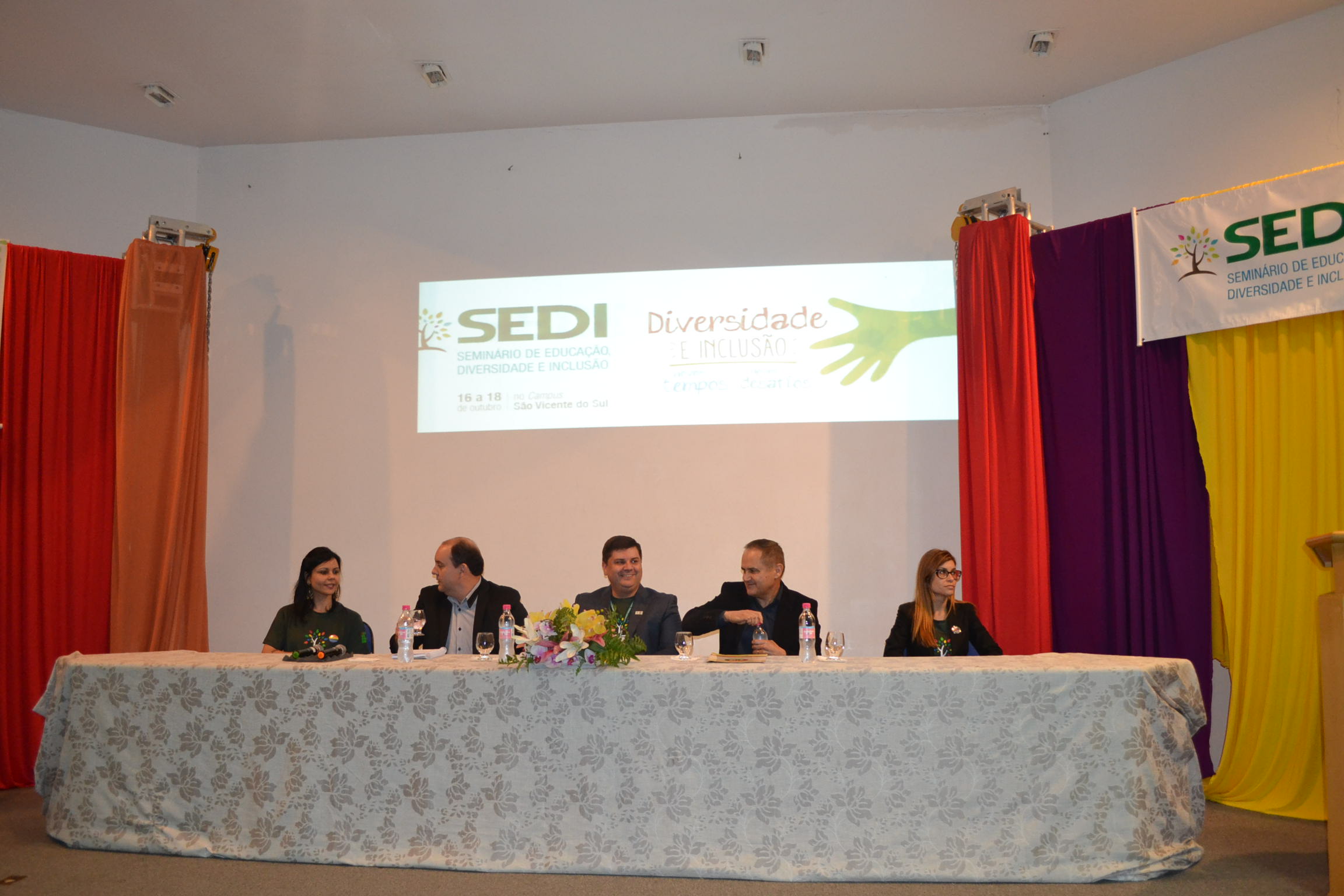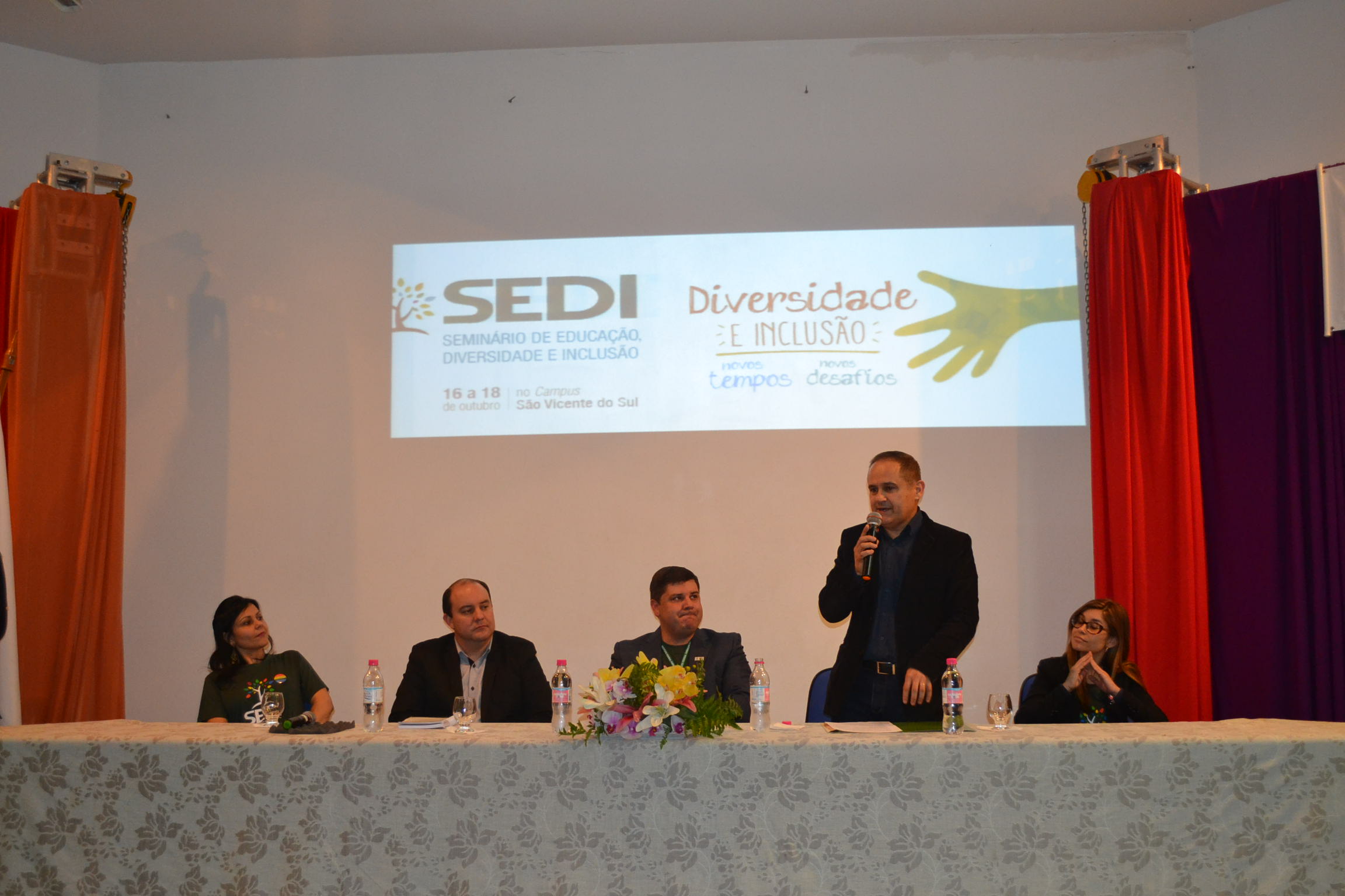 Para a abertura da quarta edição do evento, estiveram presentes o Pró-reitor de Ensino, Édison Brito da Silva, o Diretor do Campus São Vicente do Sul, Deivid de Oliveira, a Coordenadora de Ações Inclusivas, Fernanda Machado, o Diretor de Assistência Estudantil, Hermes Uberti, e a Coordenadora de Ações Inclusivas do Campus São Vicente do Sul, Letícia Jobim.