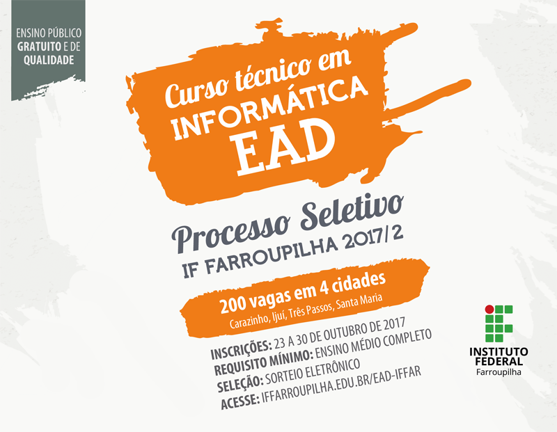 O Instituto Federal Farroupilha abriu as inscrições para a seleção do Curso Técnico Subsequente em Informática na modalidade de Educação a Distância (EaD). O período de inscrições encerra no dia 30 de outubro. São ofertadas 200 vagas a candidatos que já concluíram o Ensino Médio.