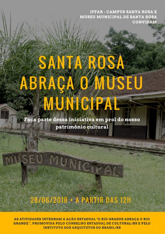 Amanhã (28), o Campus Santa Rosa irá organizar uma atividade local para participar da ação estadual “O Rio Grande Abraça o Patrimônio Cultural”, promovida pelo Conselho Estadual de Cultura e pelo Instituto de Arquitetos do Brasil-RS.